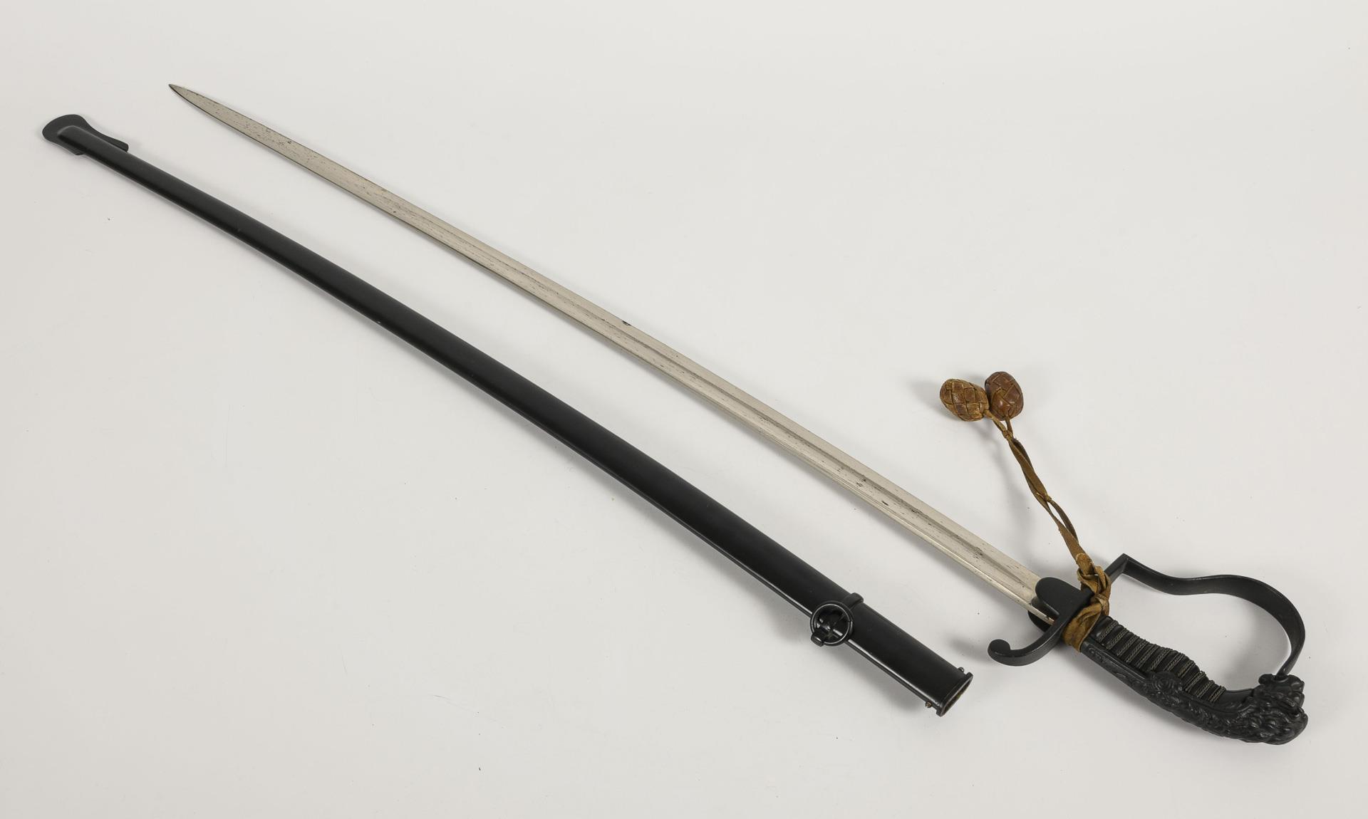 Slightly curved, single-edged blade with wide fuller. Iron hilt with bakelite grip and wire winding. Probably blackened later. Metal scabbard with a suspension ring.
