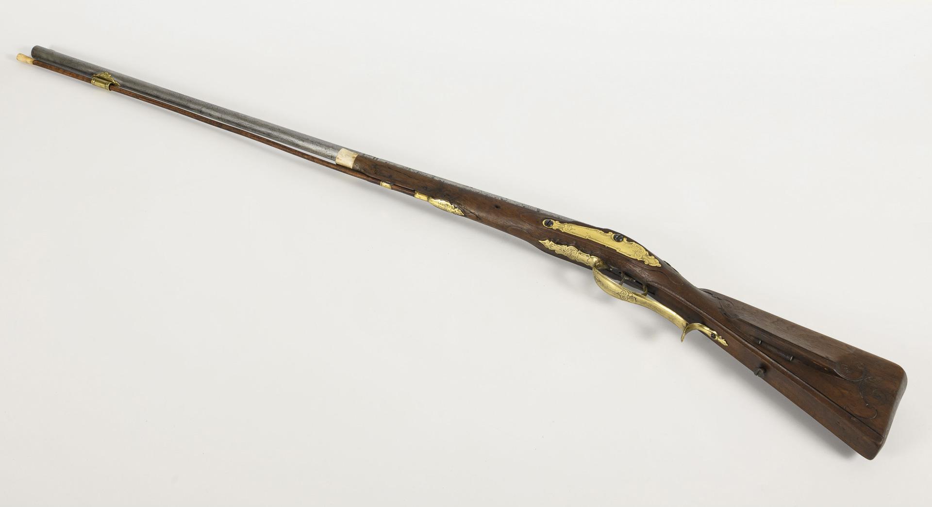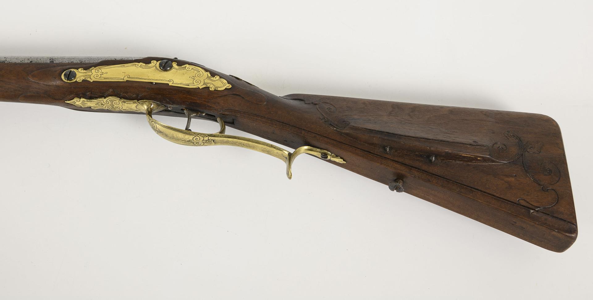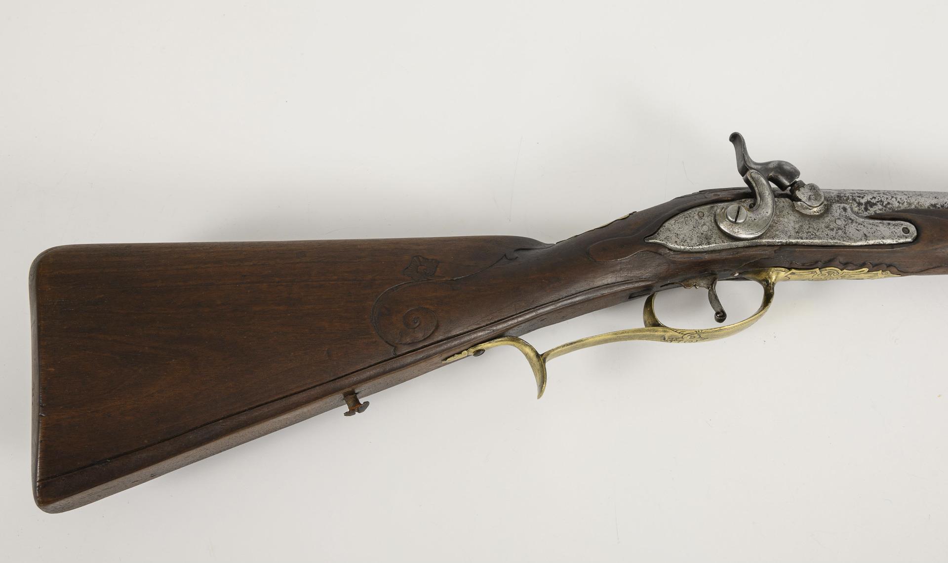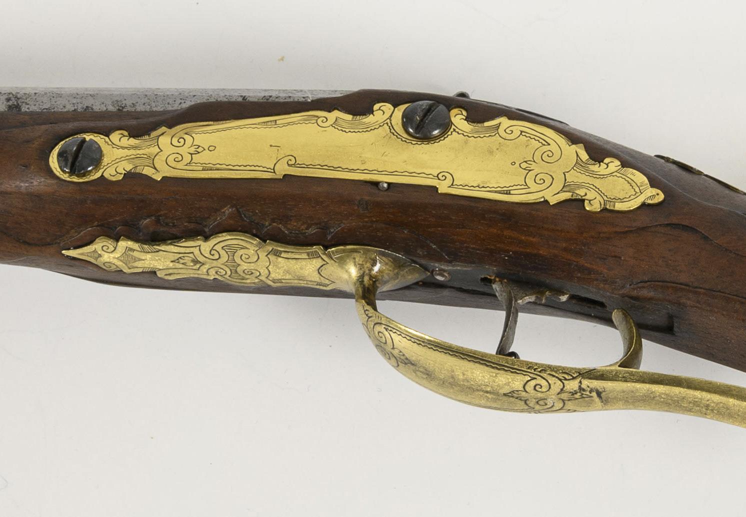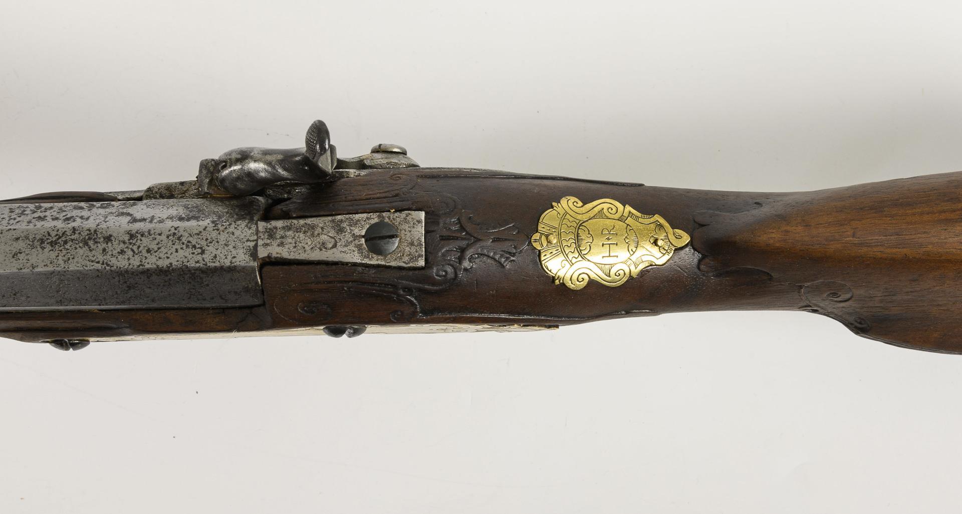 Smooth barrel, 15 mm caliber, octagonal at the rear. Wooden stock with light carved ornamentation. Counter lock and monogram cartouches "H R" made of engraved brass plates. Signs of age and use, but beautifully refurbished.