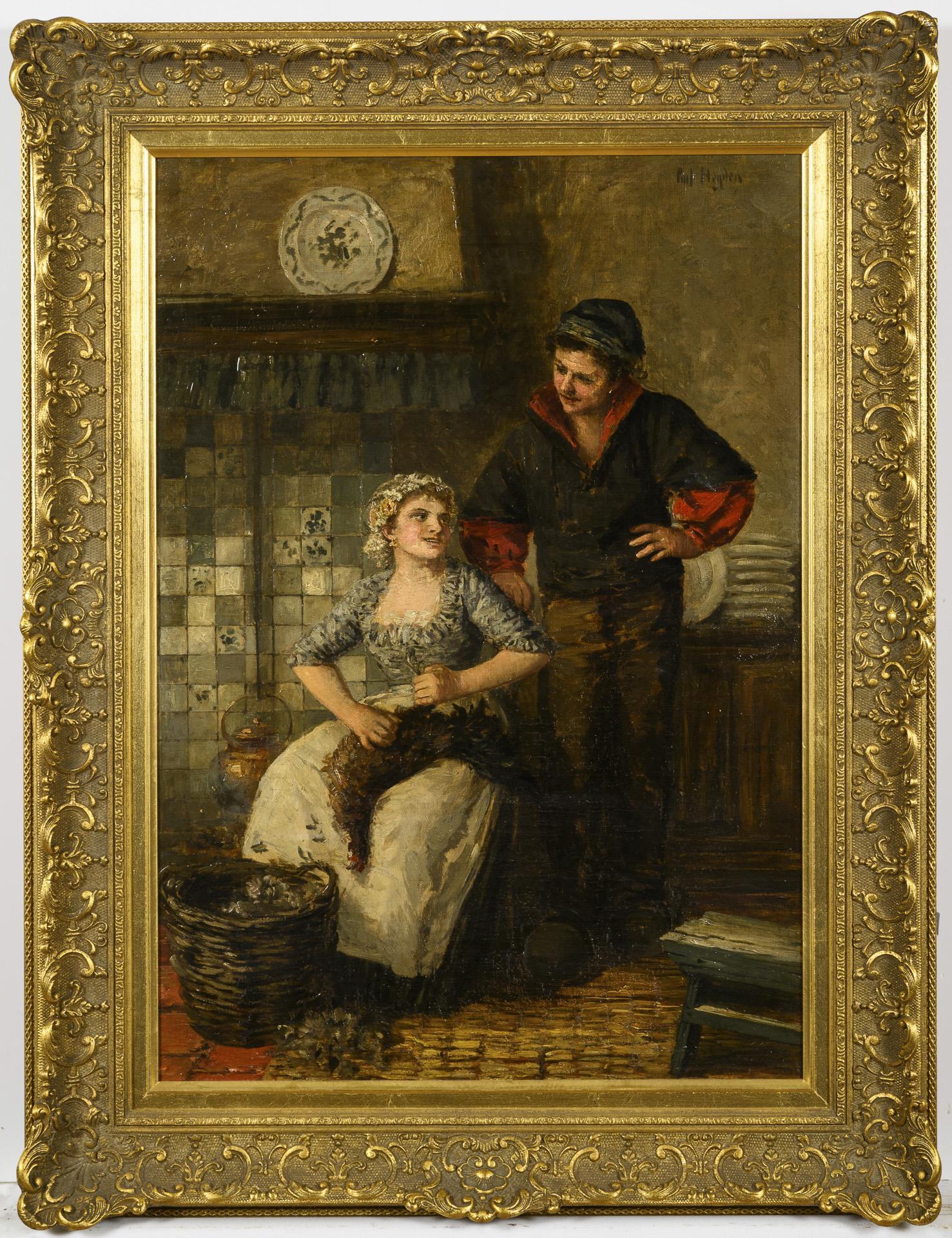 The young couple in conversation in the kitchen while she plucks a chicken. A small restored area.