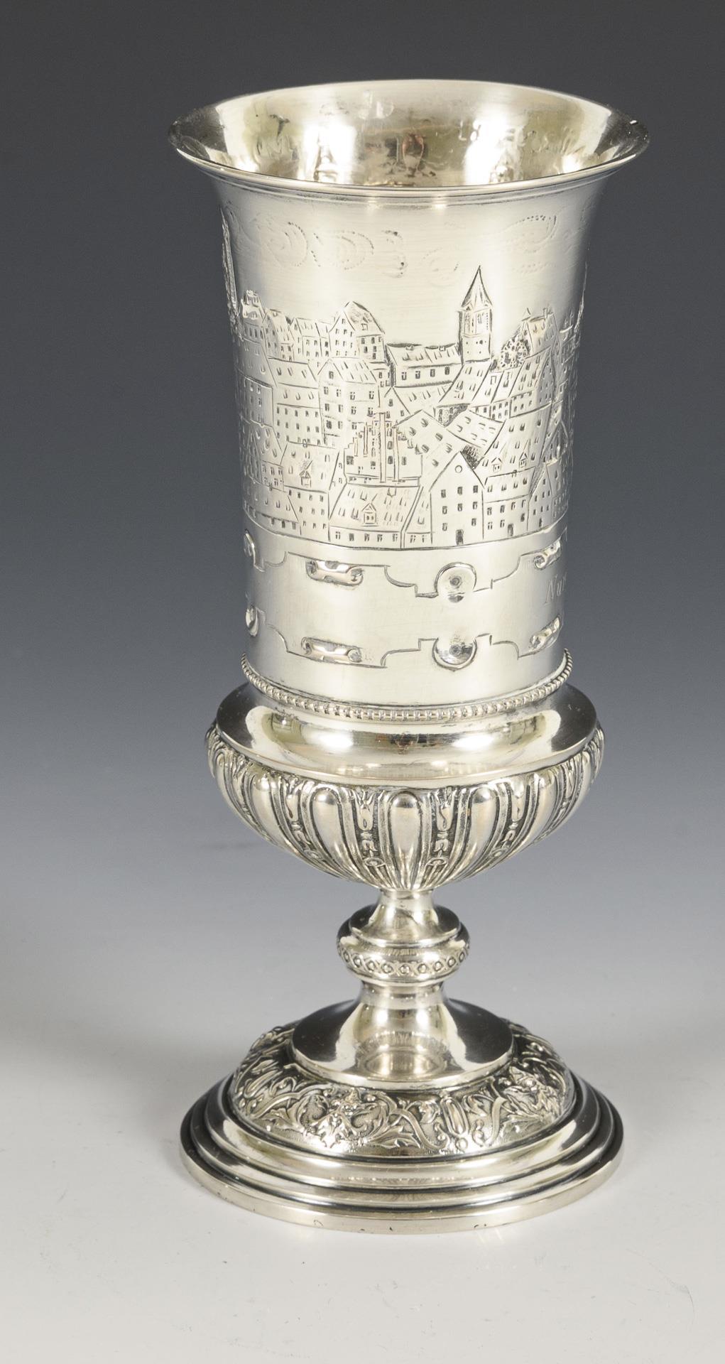 Cylindrical bowl with depiction of the city of Nuremberg and engraving. On a round foot in relief. Foot with old repair and small break, small dent at the mouth.