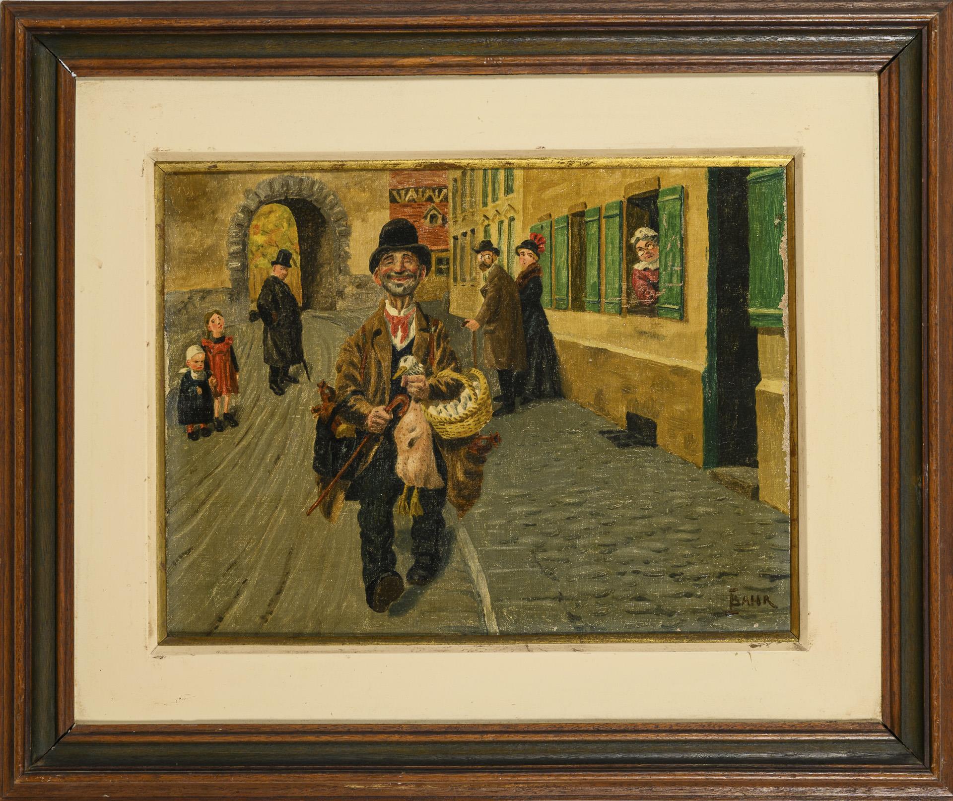 Caricatured genre scene with a cheerfully striding man being critically eyed by other people. Minimal traces of age.