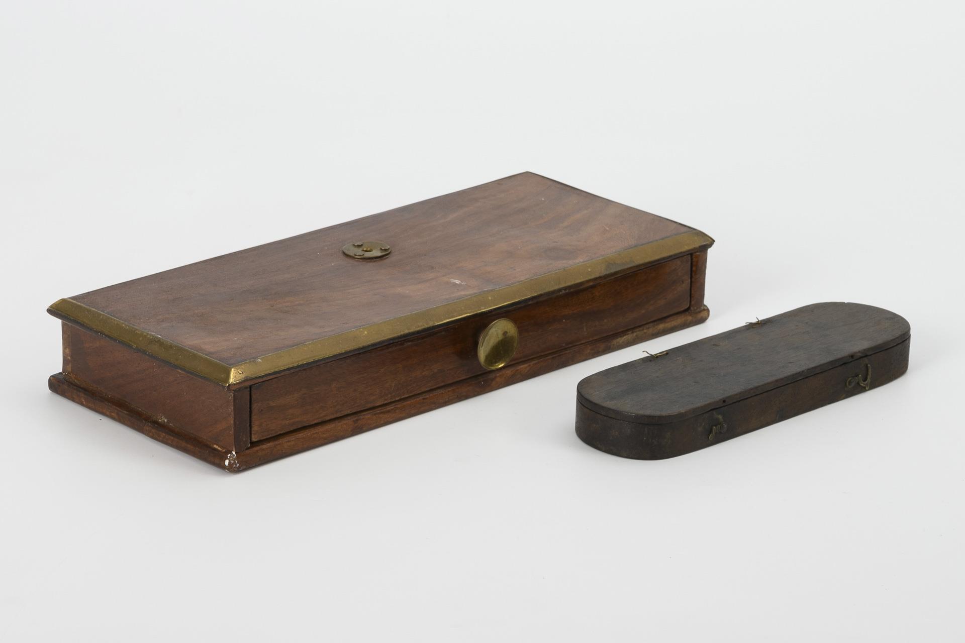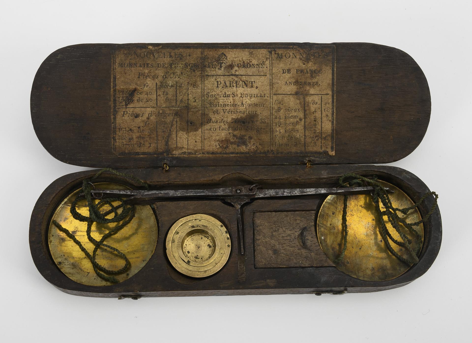 Fine scales in box with brass edge fitting. In the drawer stand for screwing onto the box and brass beam scales with 7 weights ("1GM" to "50 GM") and 3 balance weights (probably made of aluminum). / Small coin scale, adhesive label with French inscription in the lid, iron beam scale with brass weighing pans, 3 partly inscribed insert weights (1 or 2 Louis) as well as 2 types of a total of 8 balance weights under the sliding lid. Push knob replaced, small dry crack at the bottom / Hinges replaced, 1 hook broken, missing eyelets and missing insert weights, some signs of age/use.