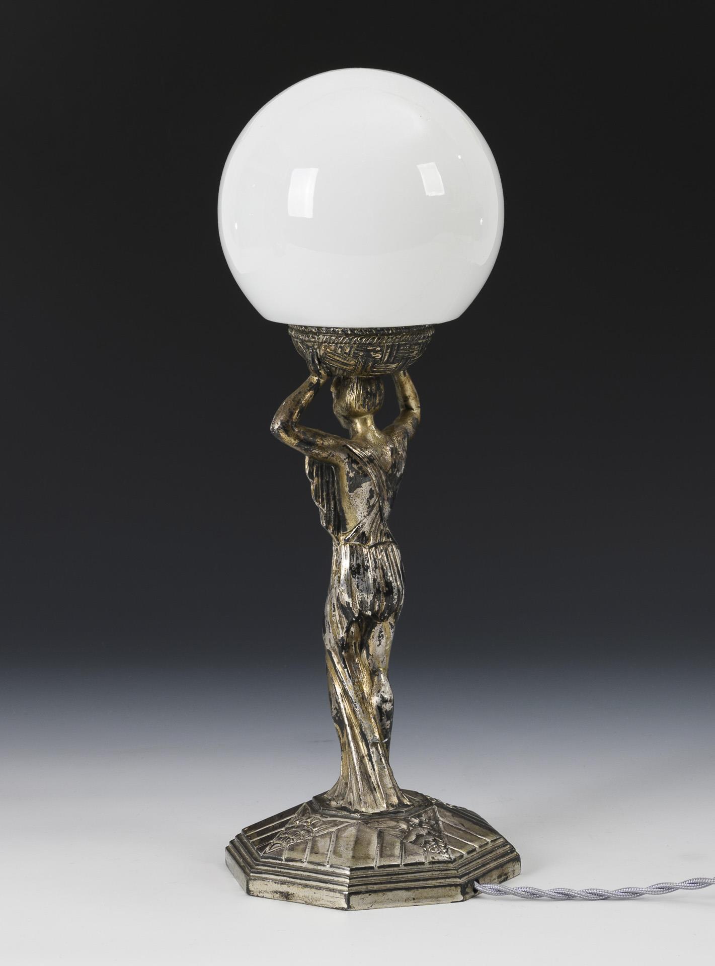 Octagonal base with geometric relief ornament, fully sculpted basket holder with partially exposed breast as shaft, spherical glass shade. Silver plating rubbed/spotted, glass shade replaced, recently electrified, works.