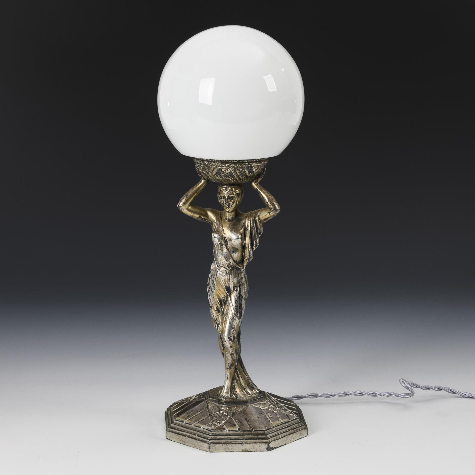 Octagonal base with geometric relief ornament, fully sculpted basket holder with partially exposed breast as shaft, spherical glass shade. Silver plating rubbed/spotted, glass shade replaced, recently electrified, works.