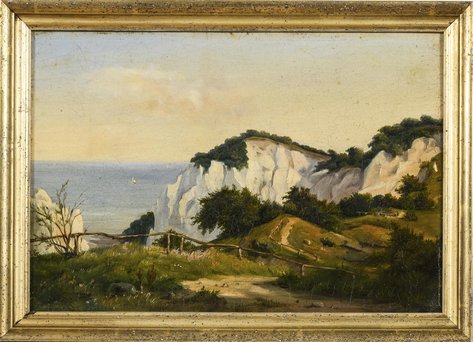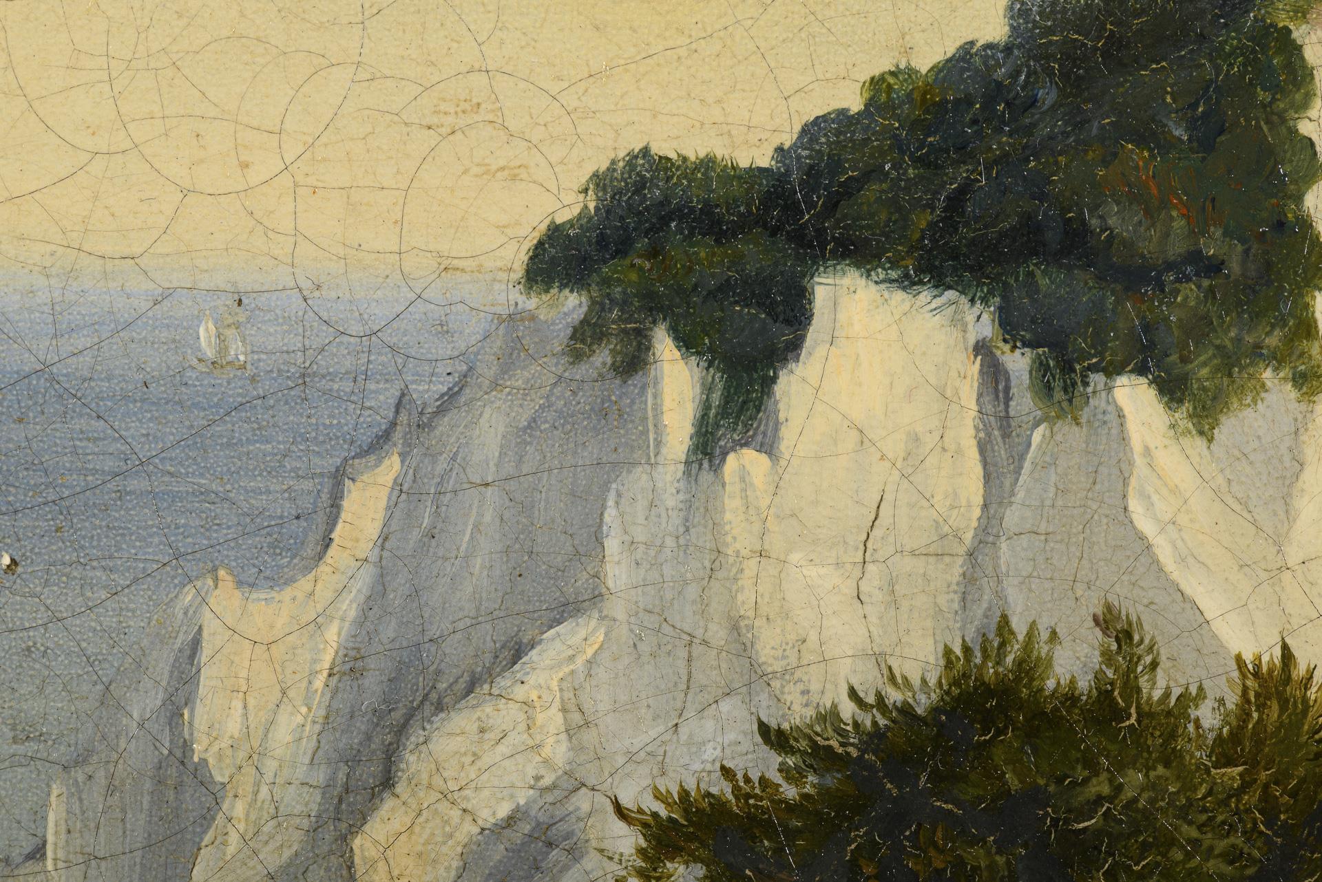 Probably the coast on the Baltic Sea with chalk cliffs in the sunshine and a view over the sea with sailors. Two restored areas with backing.