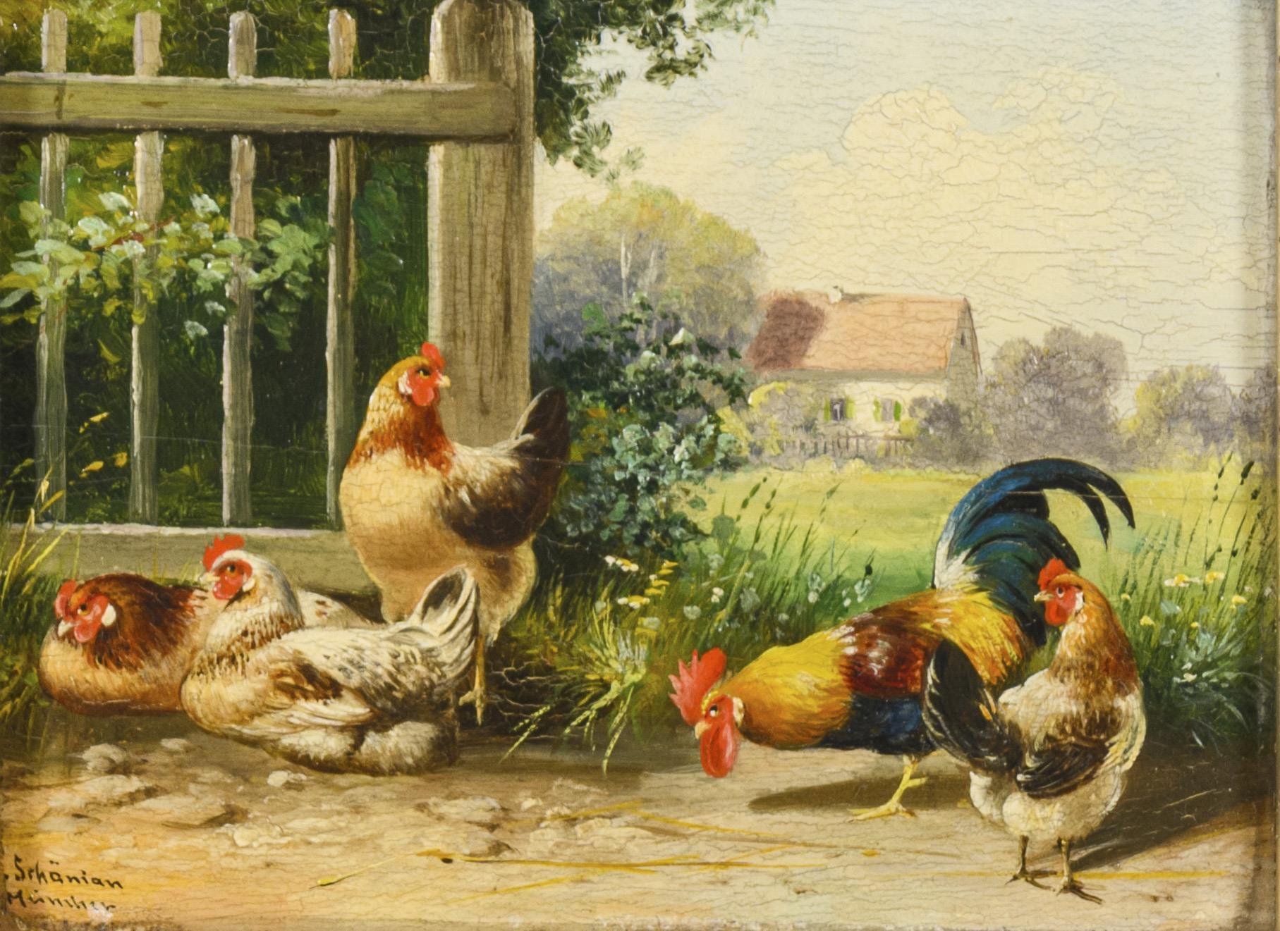 Four hens and a cockerel in the sunshine by the fence near the farmhouse. Minimal traces of age.