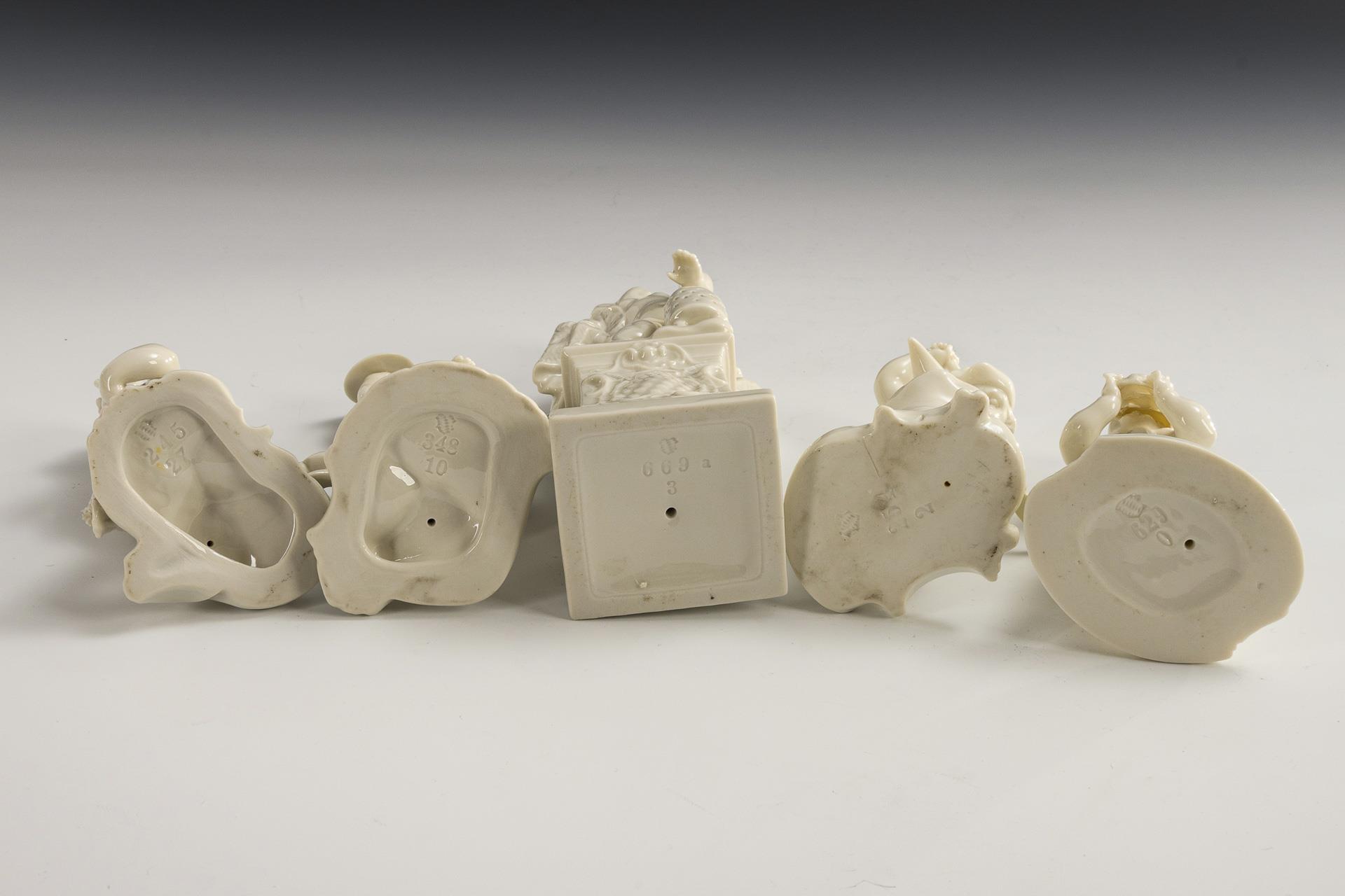 1x 669: Putto as winter on a pedestal (H 17 cm). / 1x model no. 629: Putto with mask (H 11 cm). / 1x model no. 254: Putto as blacksmith (H 11.5 cm). / 1x model no. 348: Putto with basin (H 12.5 cm). / 1x model no. 245: Putto with fish and paddle (H 10 cm). Restored left hand and arrow end of the "blacksmith".