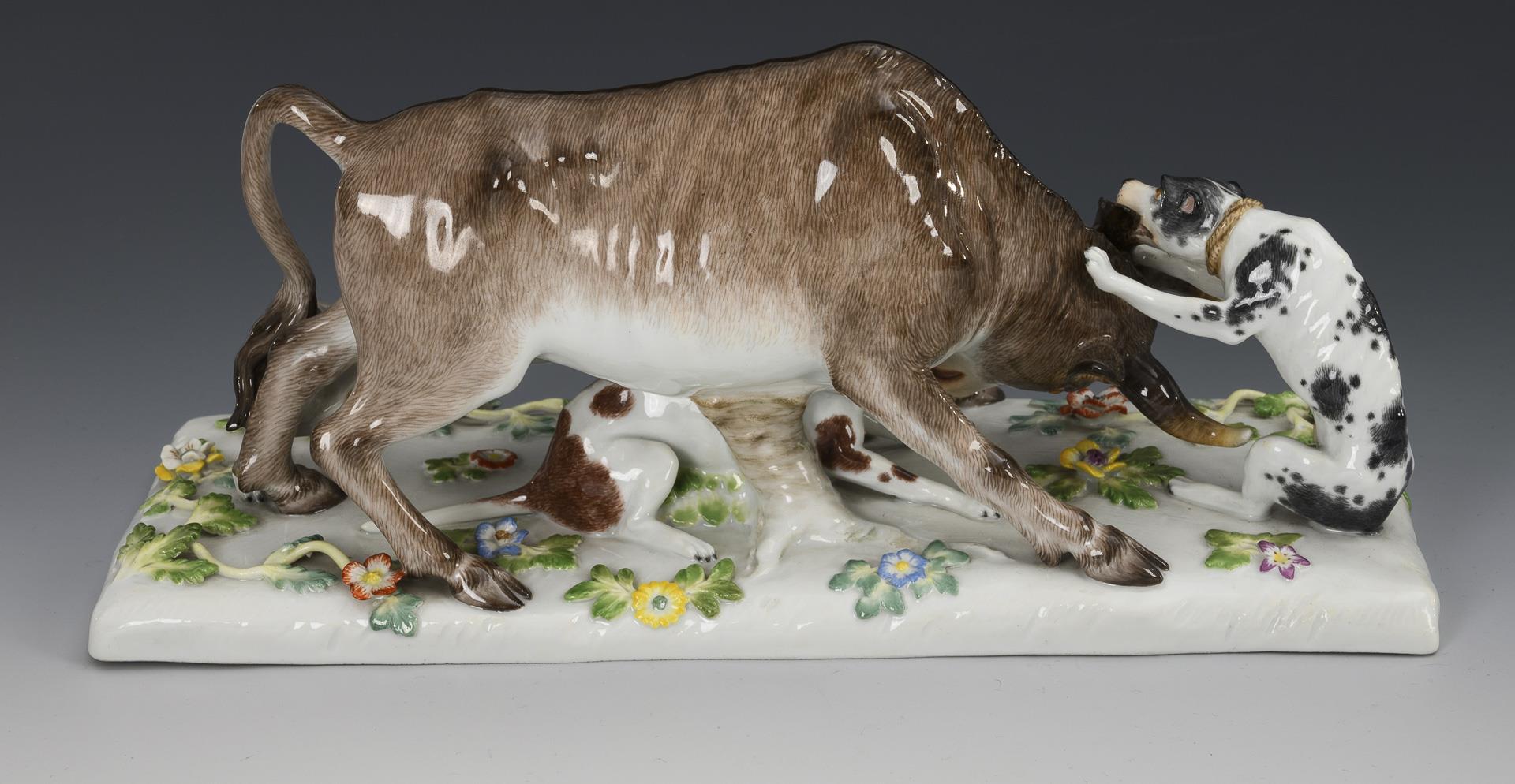 Rectangular base with floral decoration, on it a bull being attacked by three hunting dogs. 1 dog's tail added.