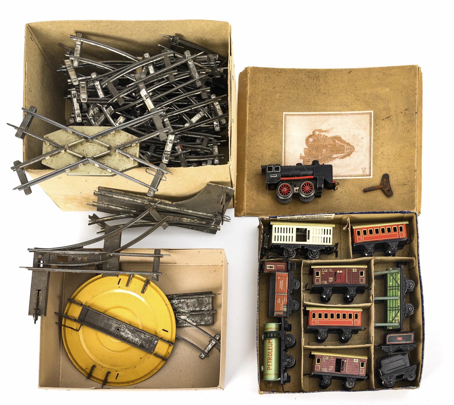 0 Gauge. Black locomotive with intact spring mechanism, 2 tenders, 8 freight cars, and numerous tinplate tracks and turnouts. In 3 boxes, including 1x defective original box. Heavy signs of use and age, 1 tender defective.