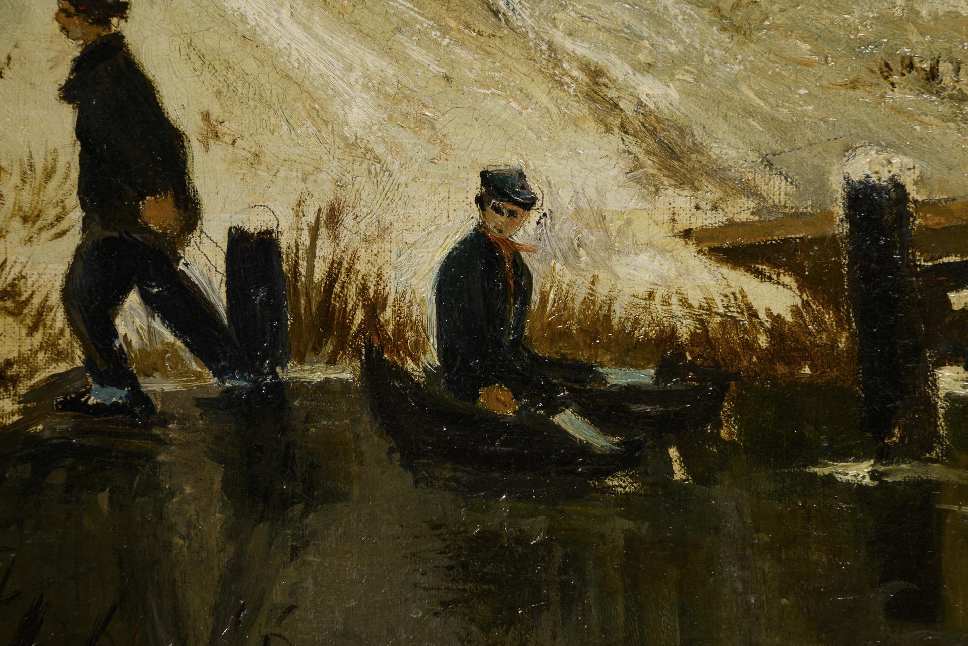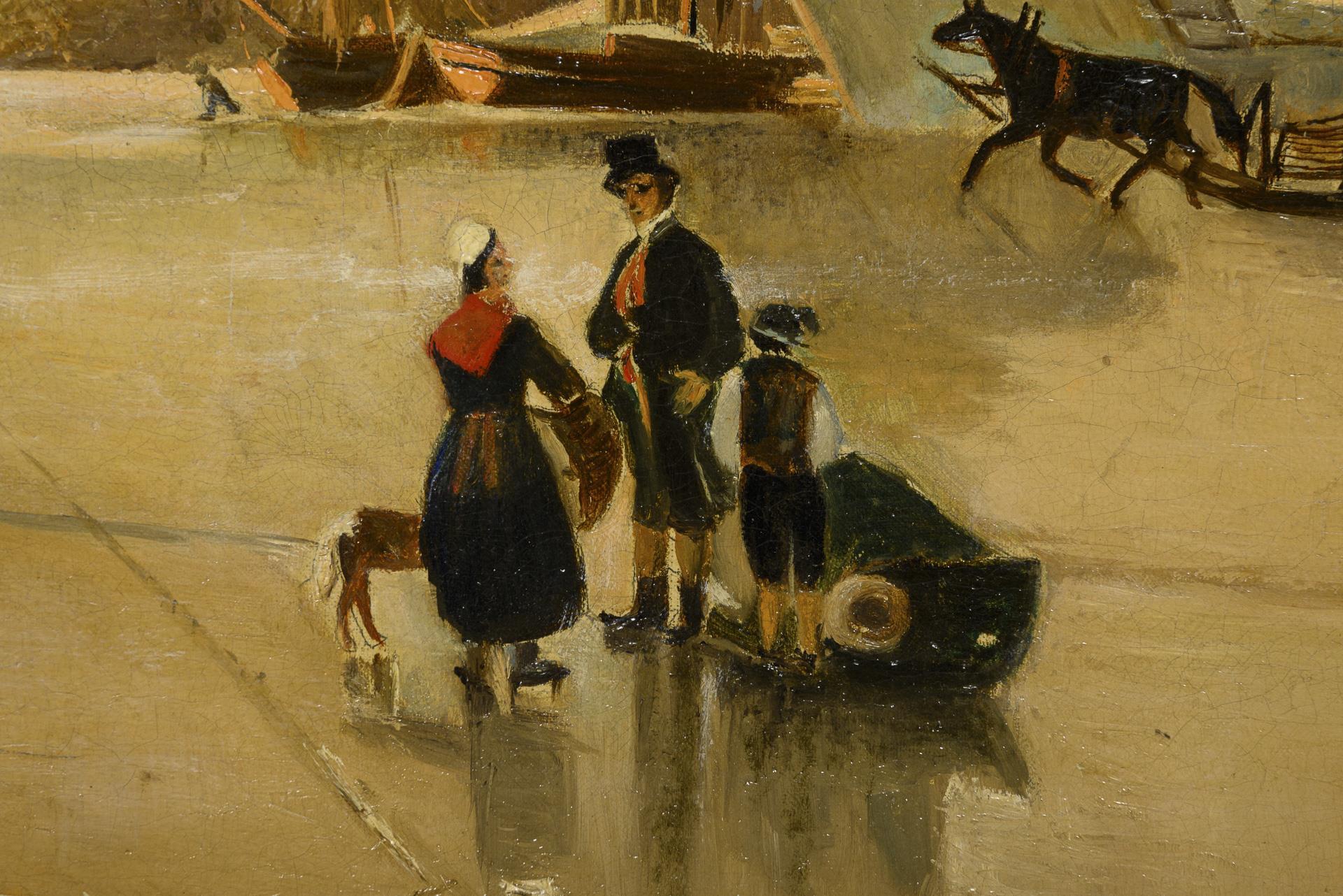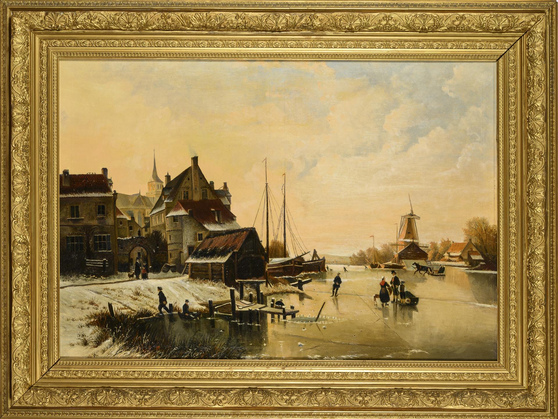 Several people with sledges or skates on the frozen river on a sunny day near the windmill. Slight traces of age.
