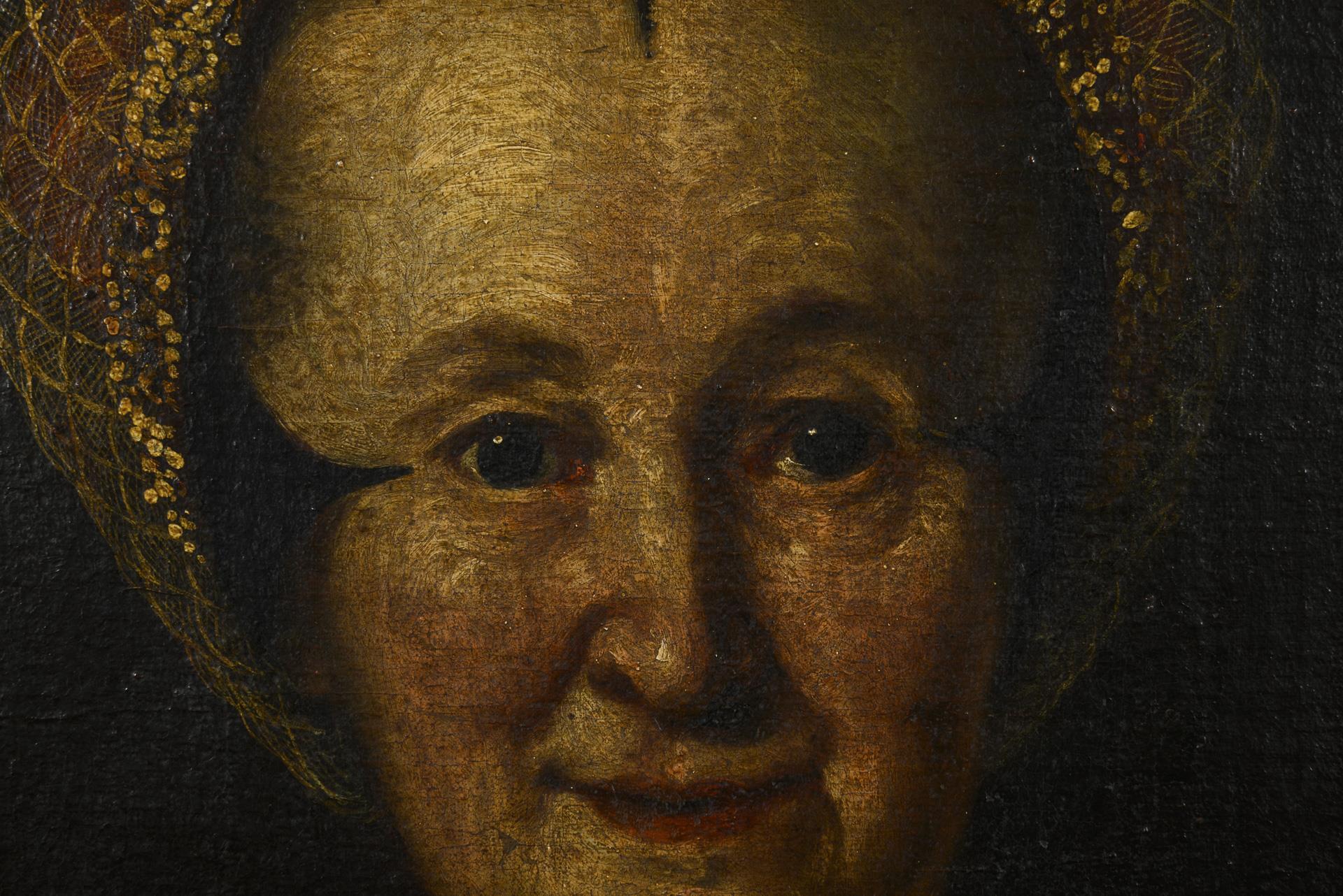 Portrait of an elderly woman in a richly patterned dress against a dark background. Canvas relined, in need of cleaning.