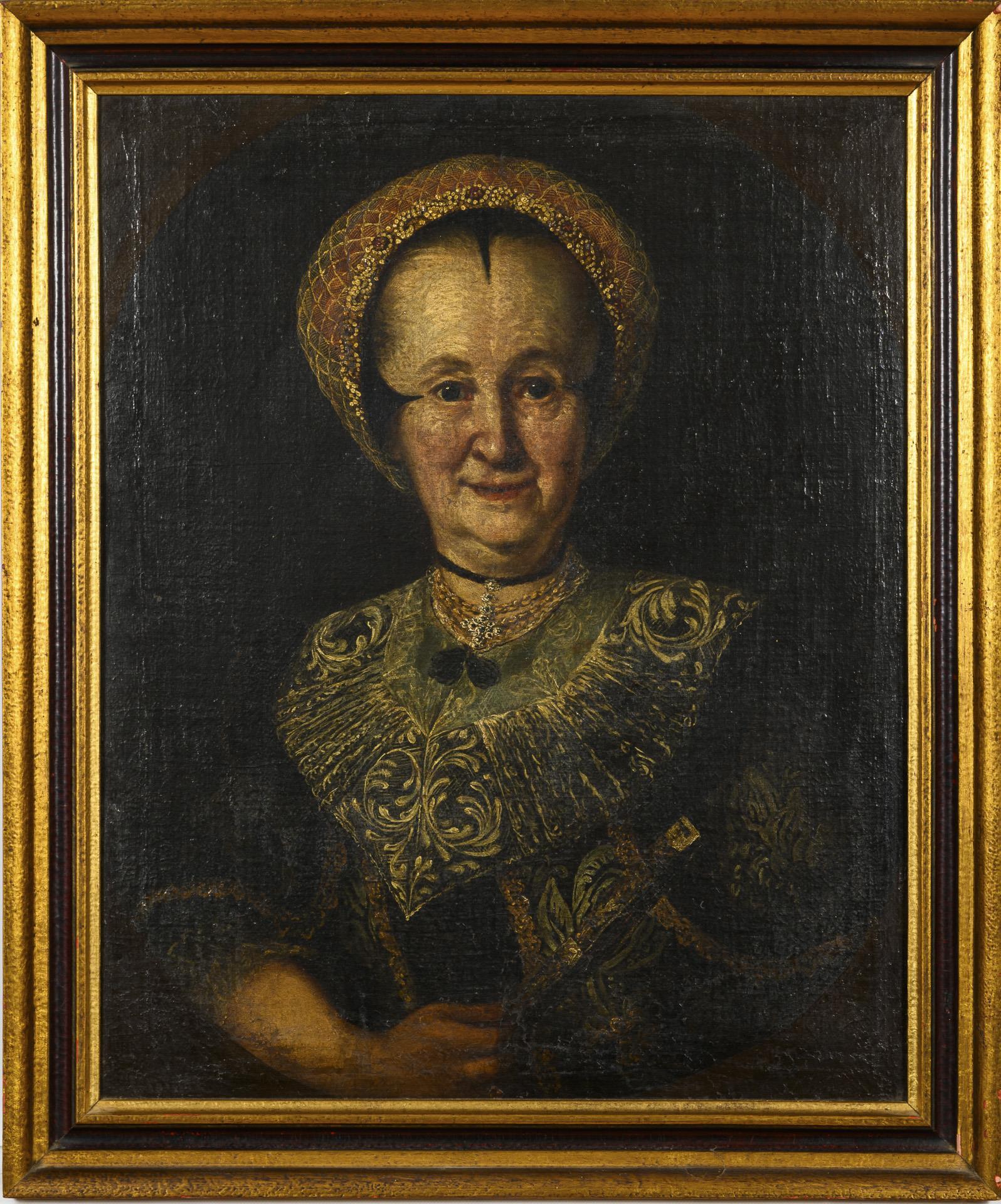 Portrait of an elderly woman in a richly patterned dress against a dark background. Canvas relined, in need of cleaning.