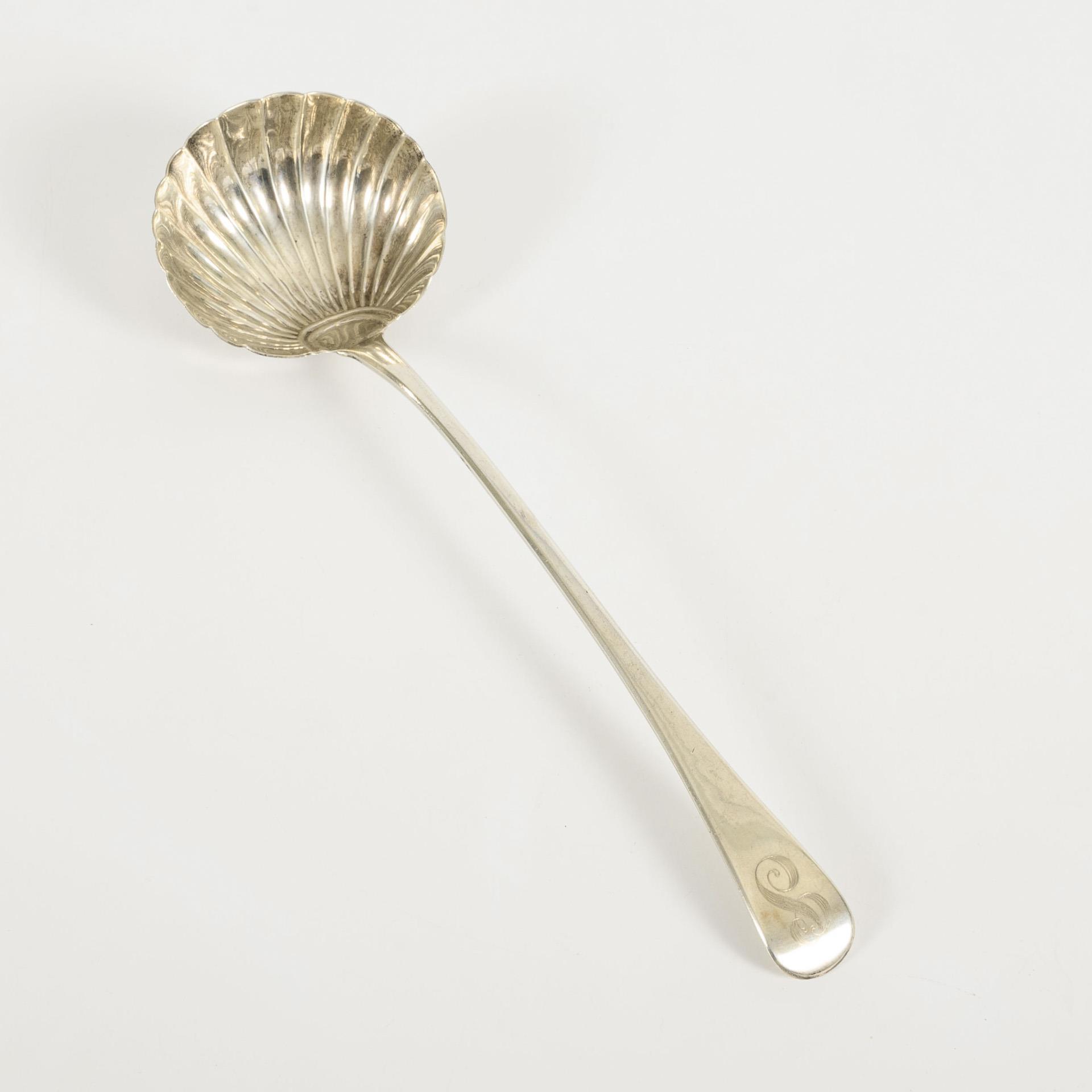 Elegant, Georgian ladle with shell-shaped scoop and engraved monogram "S". More recent dedication on the reverse "From Suzy 1991".