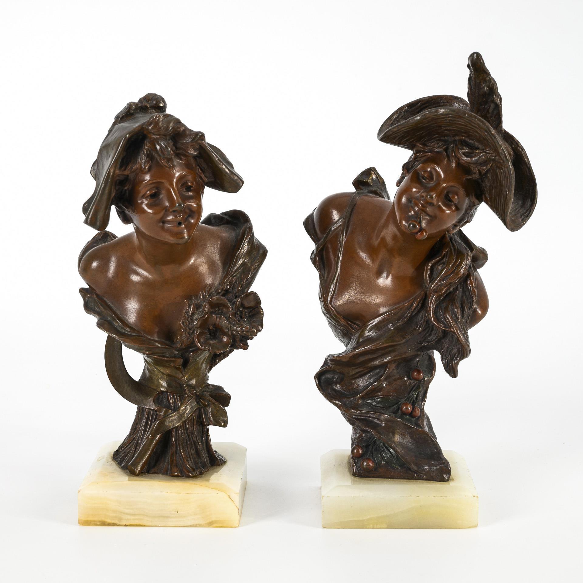 Each bronze with two-tone patina, white onyx marble plinths. Each inscribed, each foundry mark "Société des Bronzes de Paris". H 20.5 and 18 cm respectively, total maximum 22 cm. Total weight 3.4 kg.