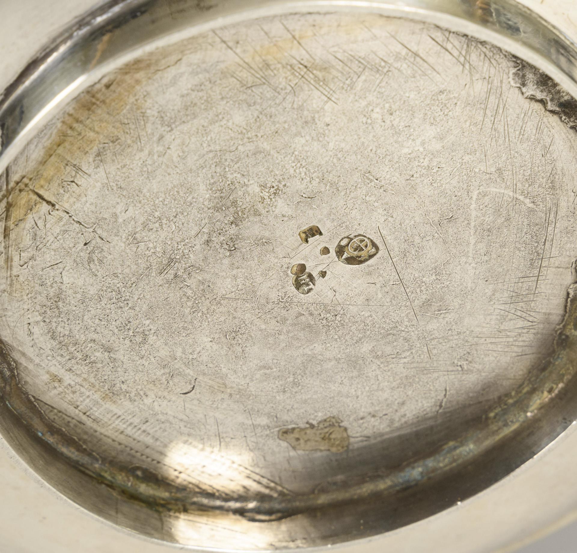 Flat form with slender snout and wooden handle. Knob with dry crack, small dents, lid and stand ring with traces of soldering.