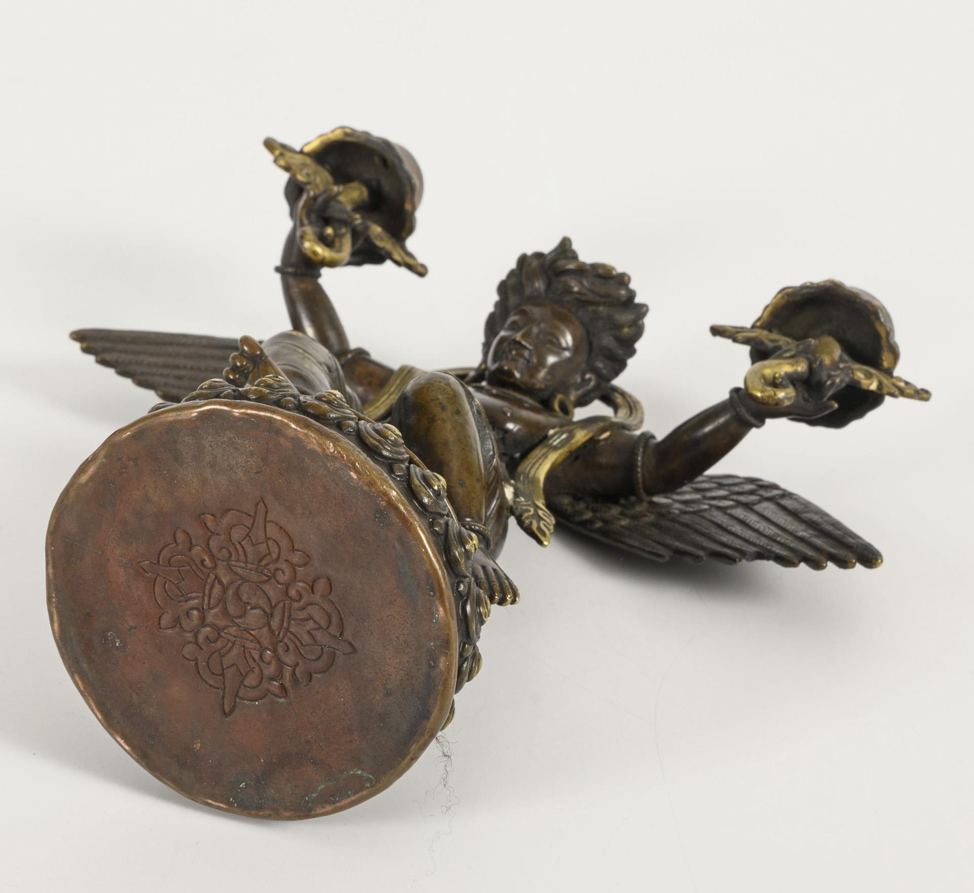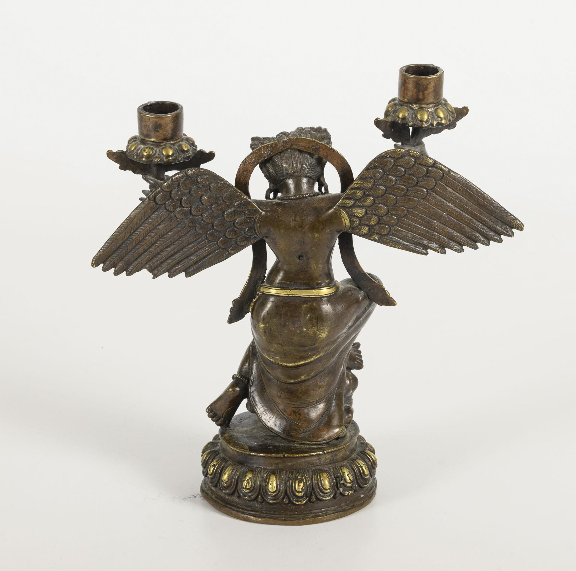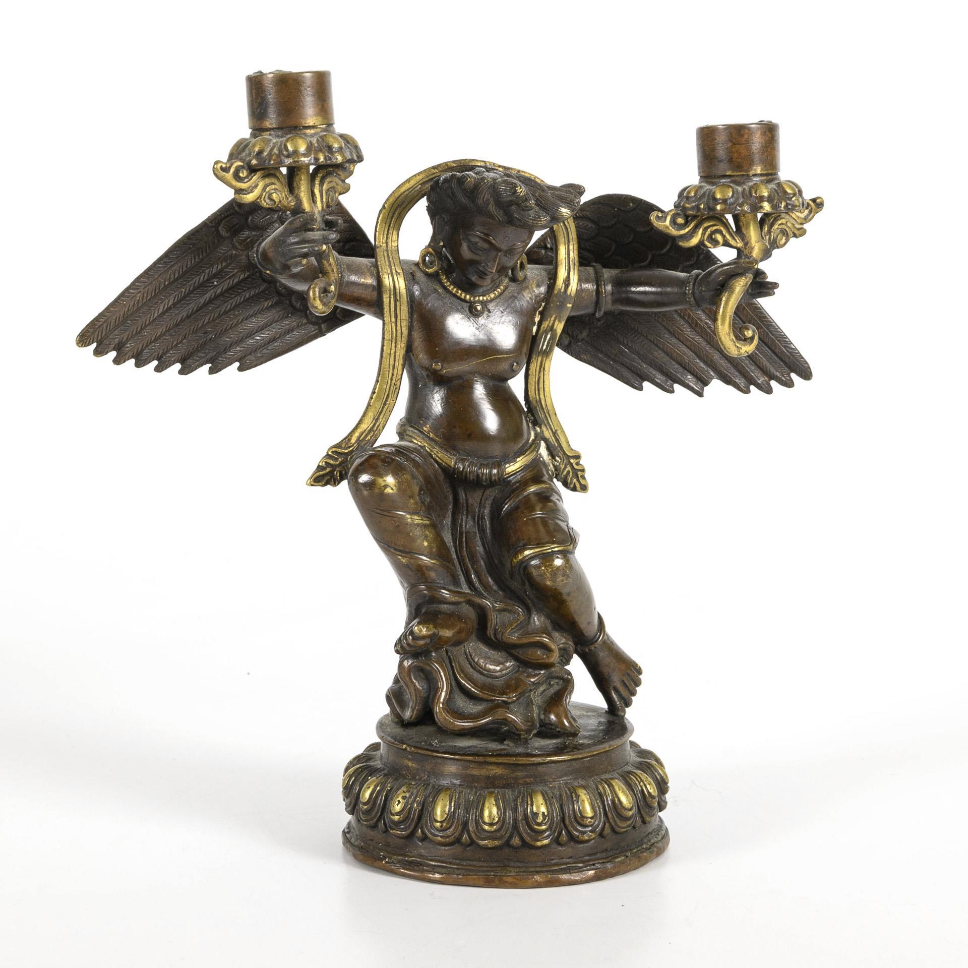 Male figure with wings, as a holder for two candle holders, on a lotus base. High quality workmanship.