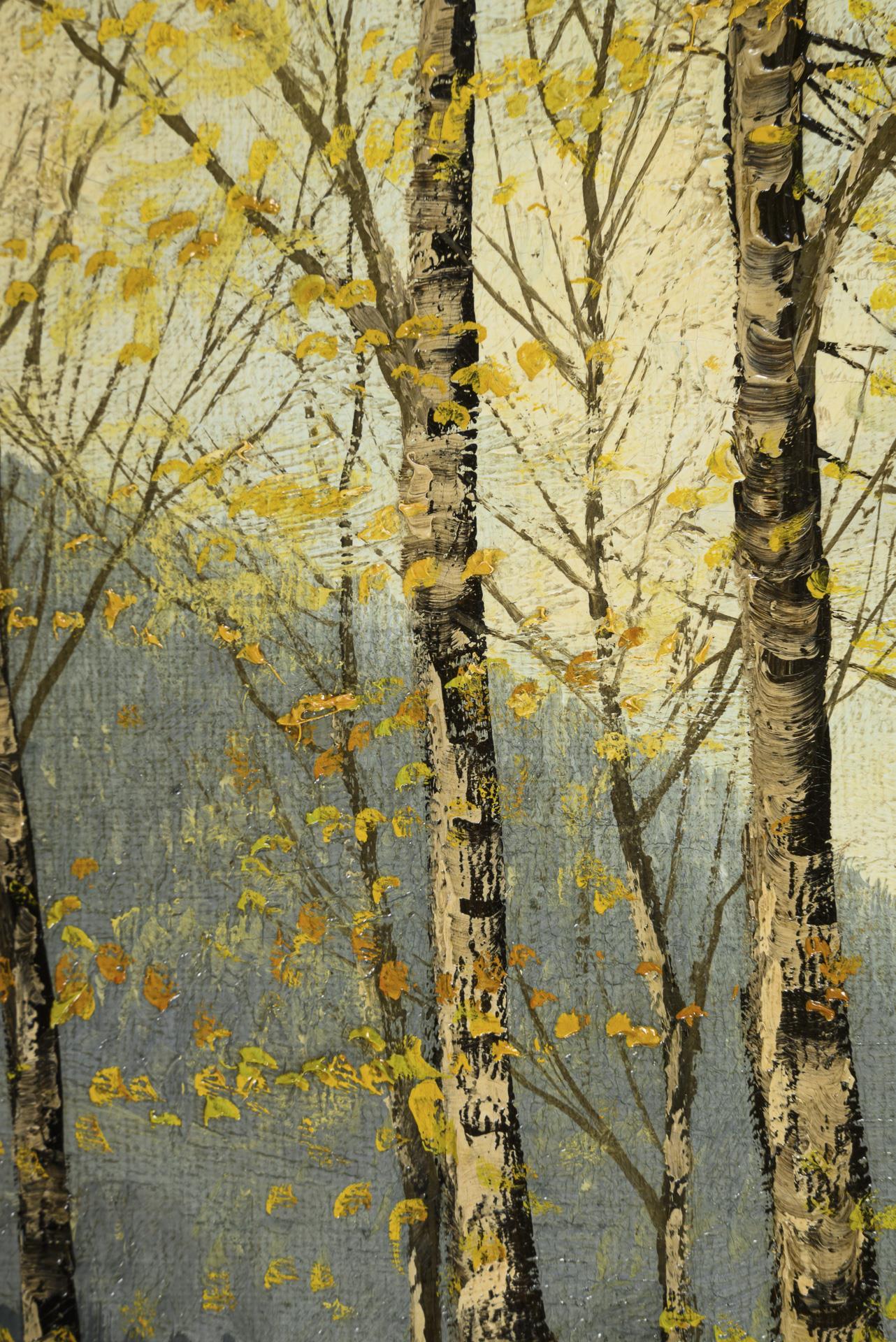 Birch trees at the edge of a forest by a stream and a path in a mountainous landscape. A small defect.