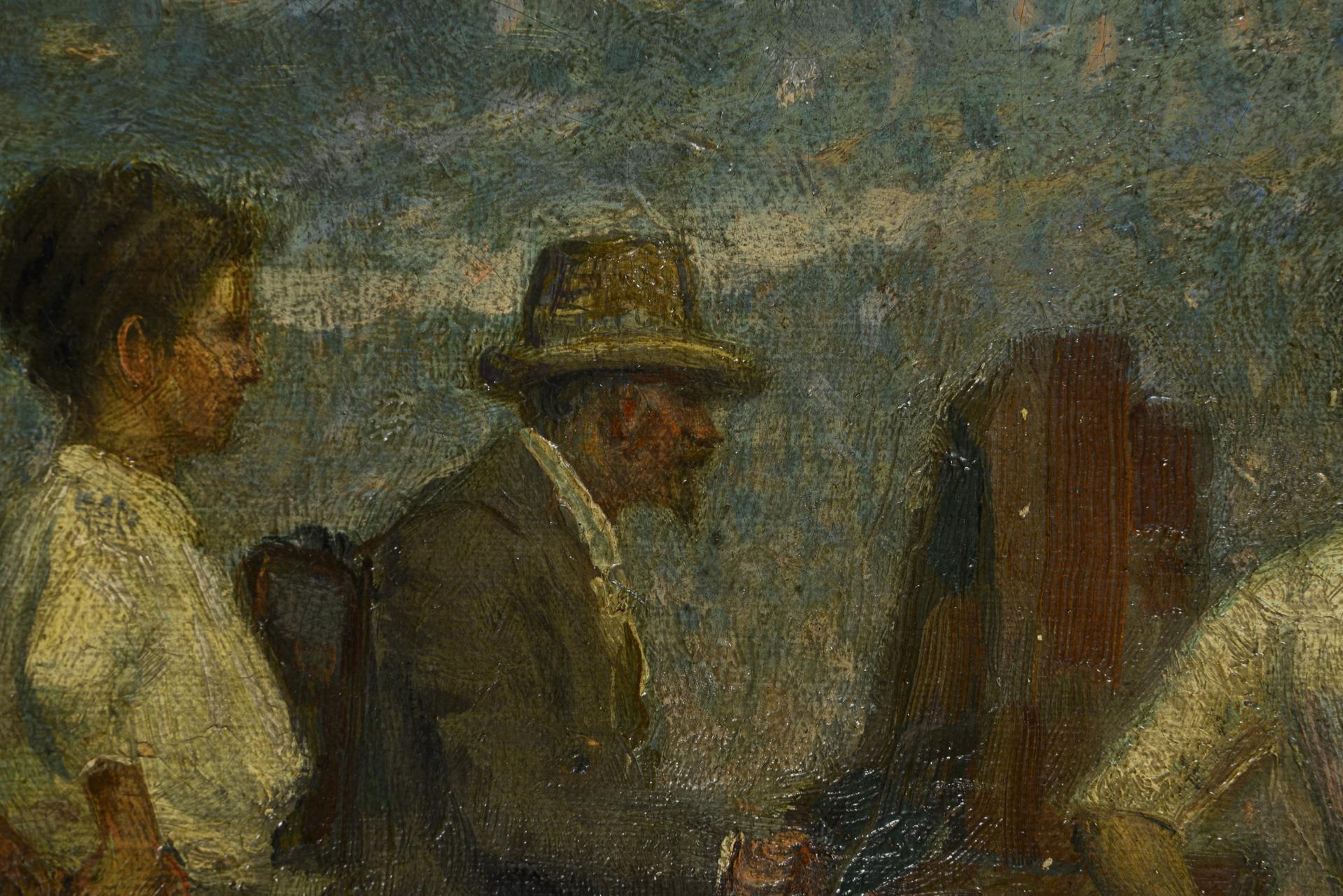 Several people in turn-of-the-century clothing with a camera in the bright sunshine on the beach. Yellowed varnish.