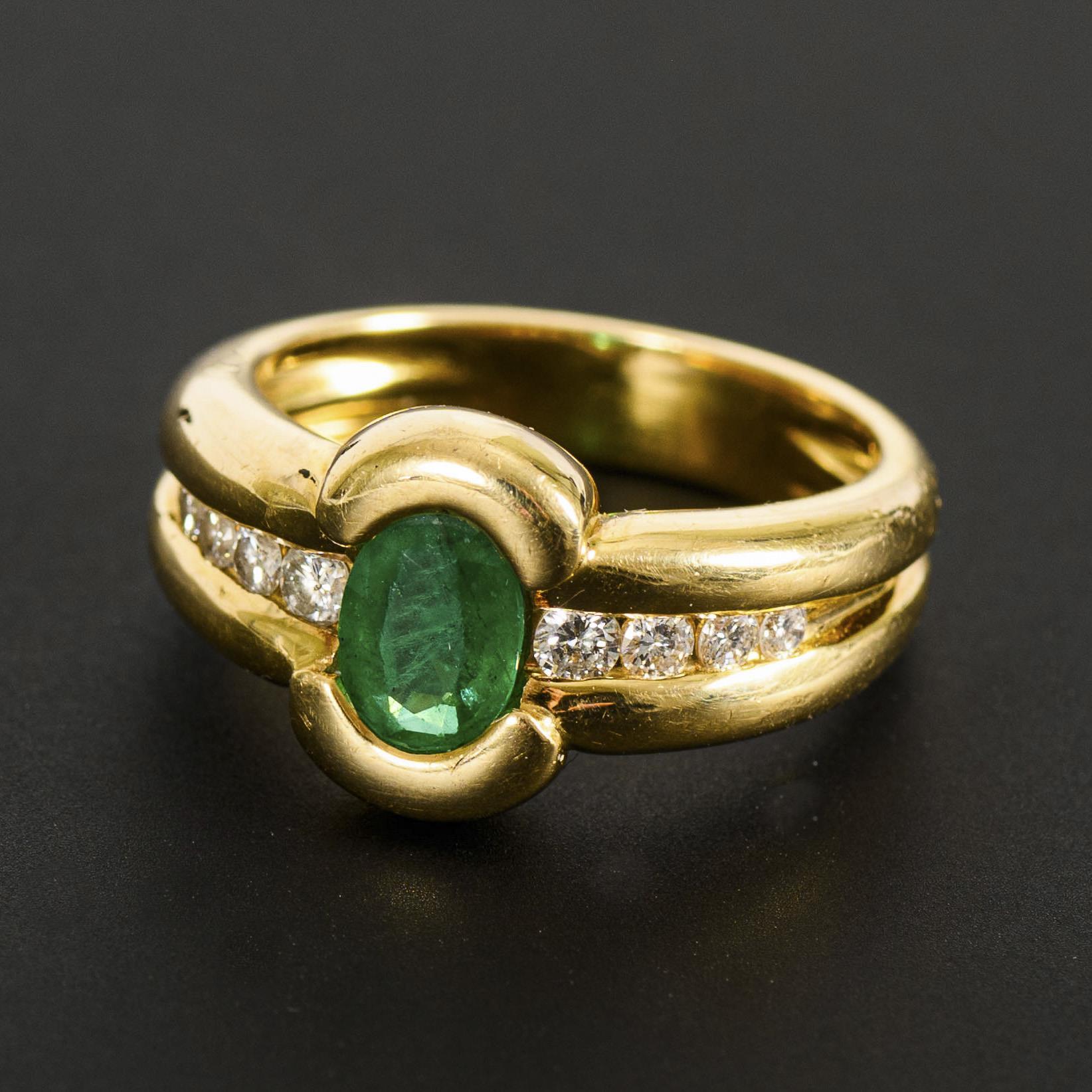A large oval-cut emerald, flanked by 4 channel-set brilliant-cut diamonds on each of the ring shoulders, in a wide band. Slight signs of wear on the ring band.