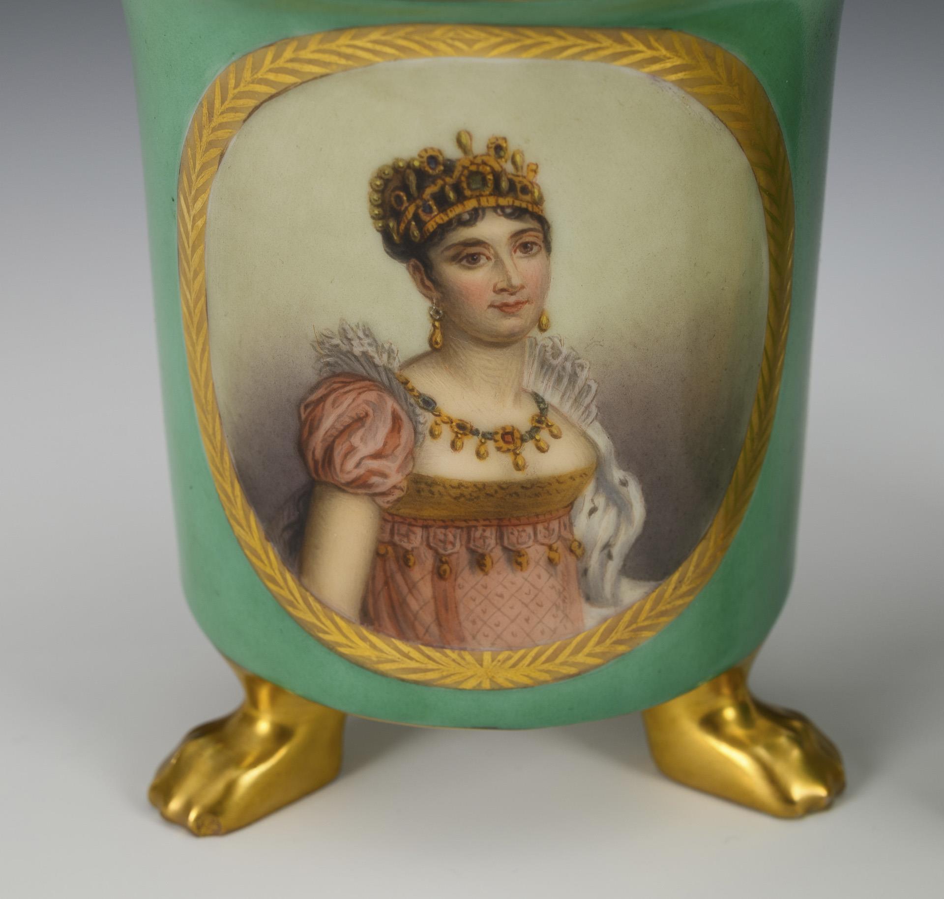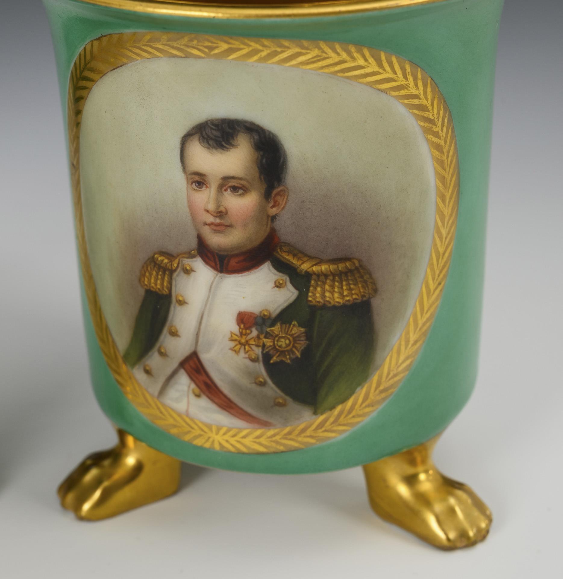 Cylindrical cups with crater rim, rocaille handles and three paw feet. Green ground, on the front a gold-framed medallion with the portraits of the French ruling couple, gilded inside.