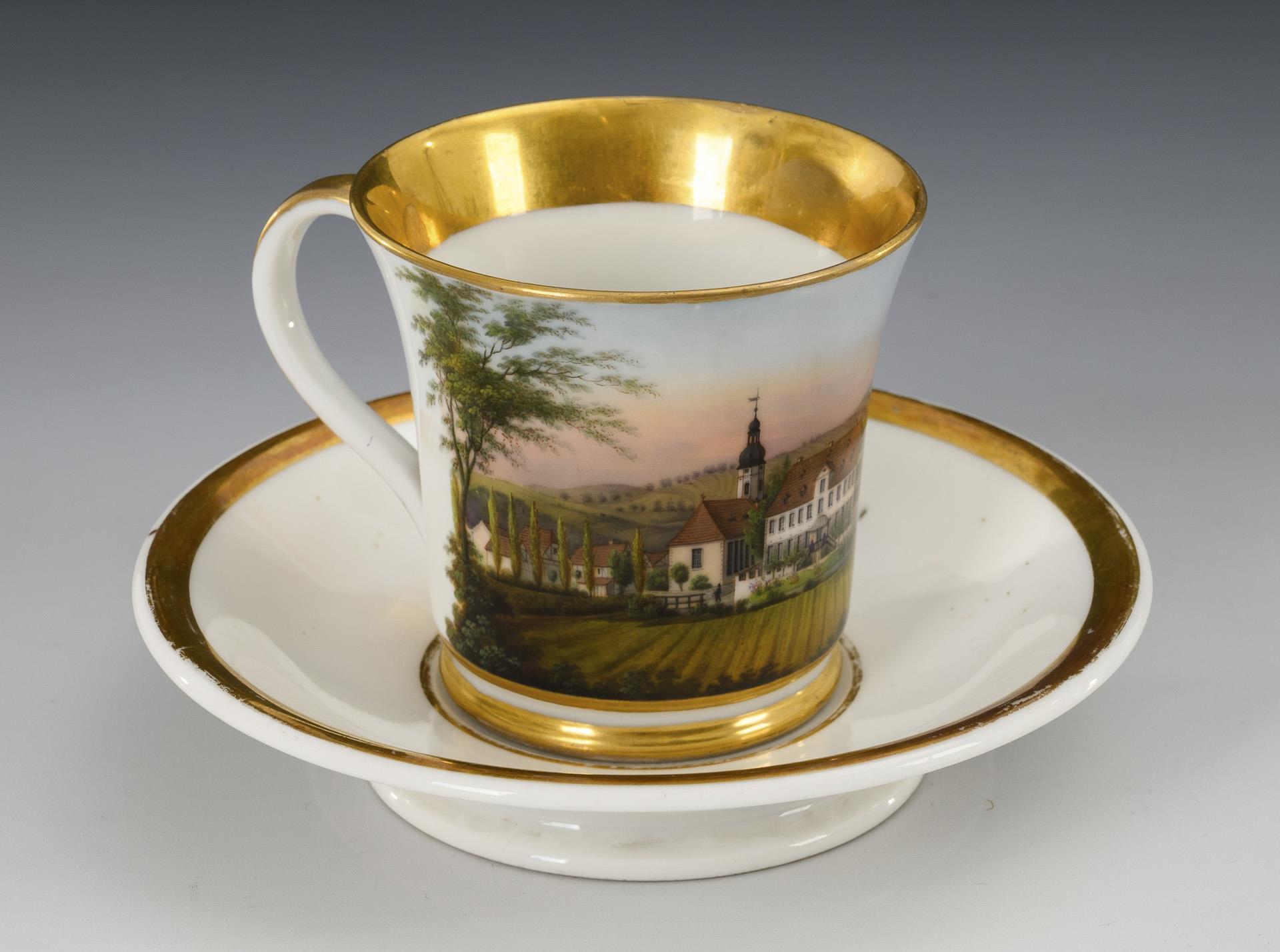 1x footed bell cup with rosette handle: on the front a gold-framed rectangular cartouche depicting a mountainous landscape with a town by a lake (H cup 11 cm, Ø completed saucer 15.5 cm). / 1x bell cup with ear handle and a depiction of a town with church and manor house on the front (h cup 7.5 cm, Ø added saucer 14 cm).