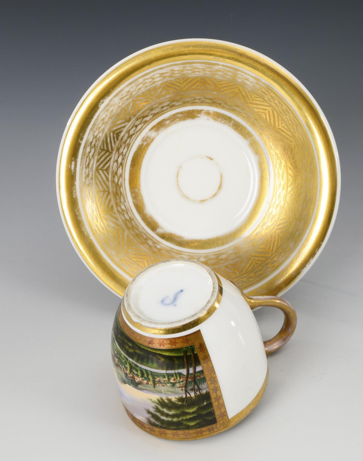 Polychrome painted, decorated in gold. Cup (h 8 cm), completed saucer (Ø 14.5 cm).