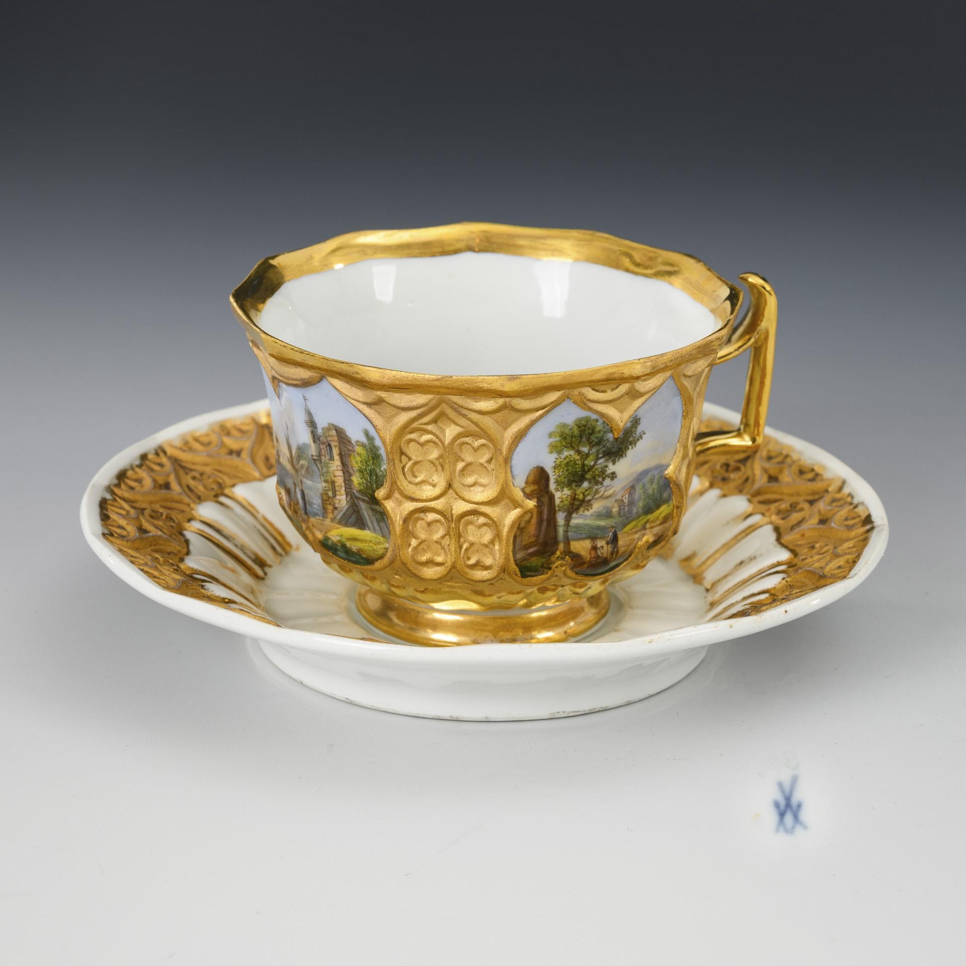 Footed, polygonal bell-shaped cup with pointed, curved handle and gothic, gold-bronze relief. Three cartouches depict two coastal landscapes with merchants, ships and goods and a mountainous landscape with hikers. Restored wall hairline crack to the cup, gold abrasion to the saucer.