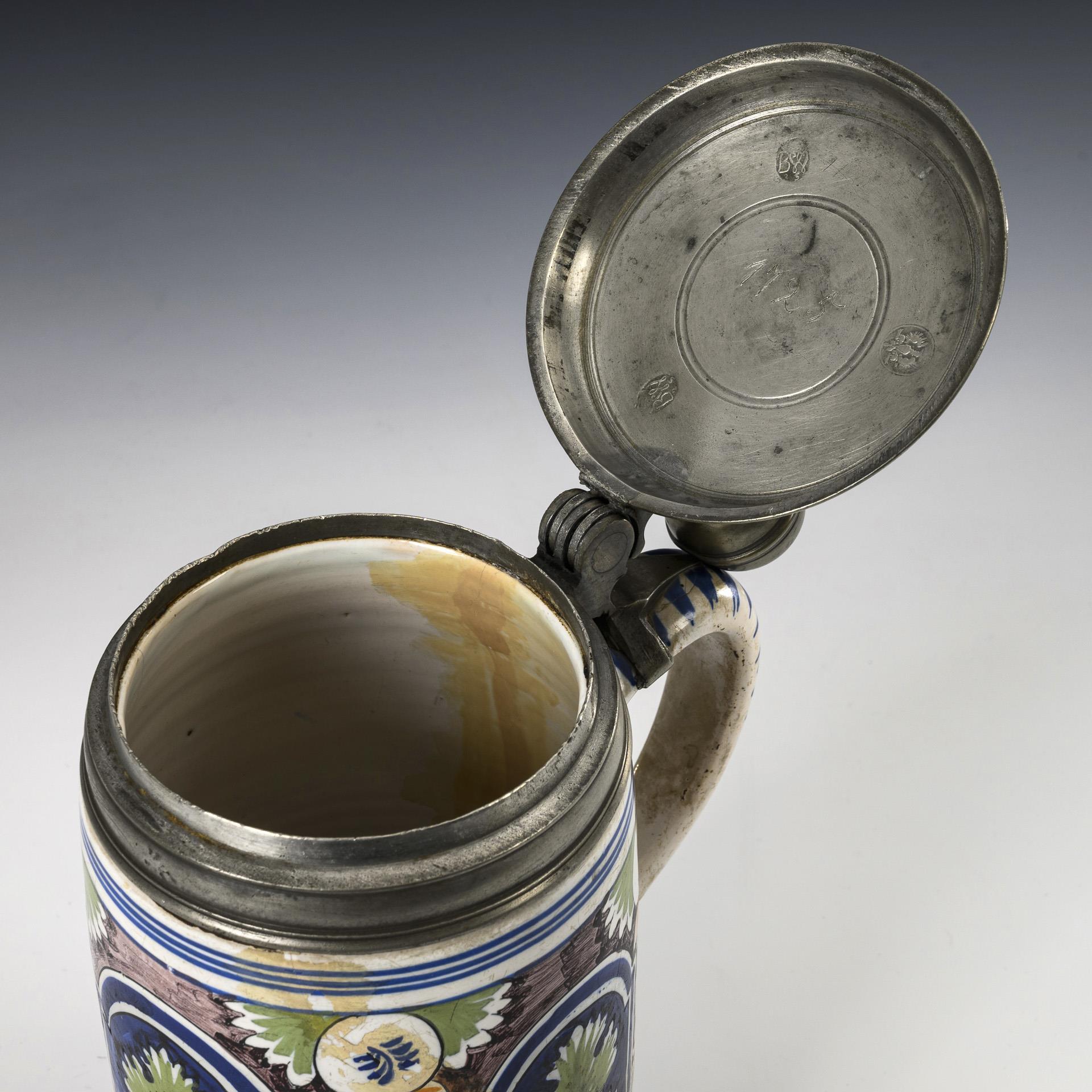 Cylindrical body with line-decorated band handle, 3 flower-filled baroque reserves and floral frame decoration on the front. Profiled pewter lid with defective relief plaque and ball pusher, hallmarked inside, pewter stand ring. Restored, finely cracked, signs of age and wear.