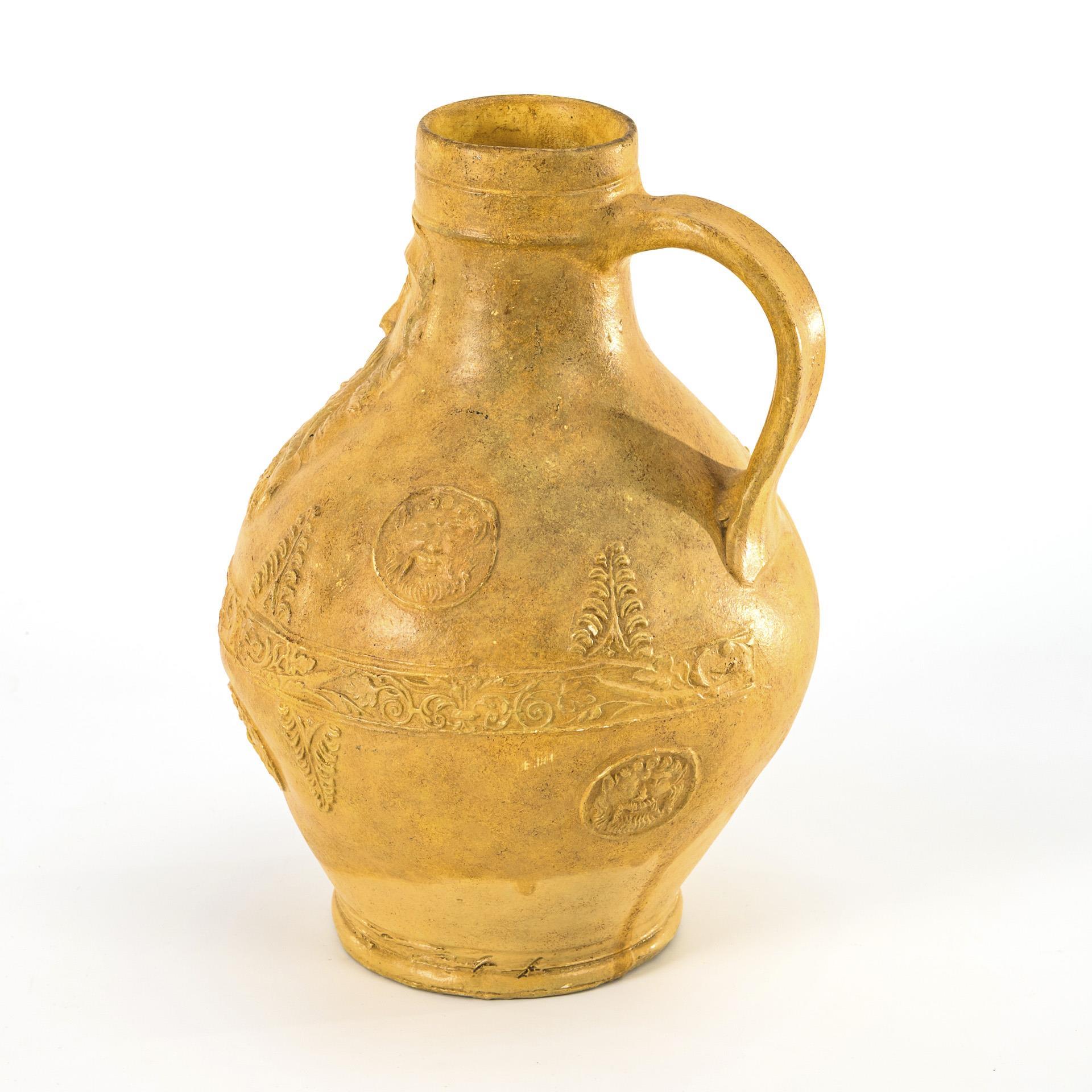 Cast in the style of the Baroque Cologne-Frechen Bartmann jugs, spherical body with narrow neck and fluted handle and offset stand. Overlay decoration with carved beard mask, floral frieze, beard medallions and acanthus leaves. Partial small chips.