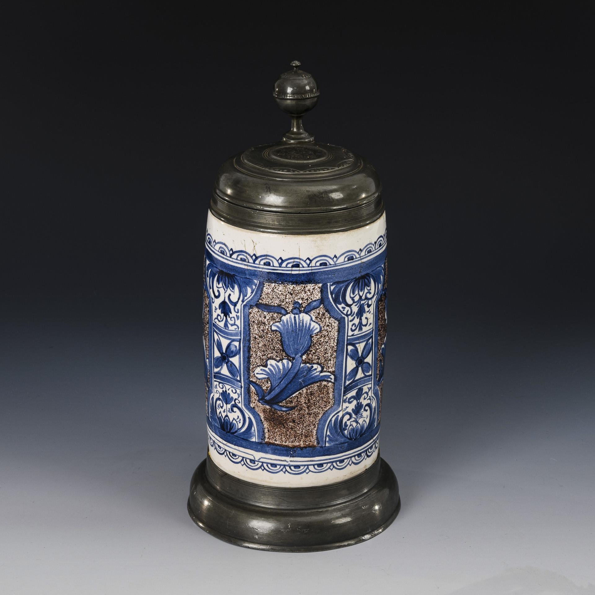 Cylindrical body with ribbon handle, surrounding pilasters and niche decoration with flowers. Pewter lid with relief plaque and ball finial, hallmarked inside, pewter stand . Slight signs of age and wear, partial glaze defects.