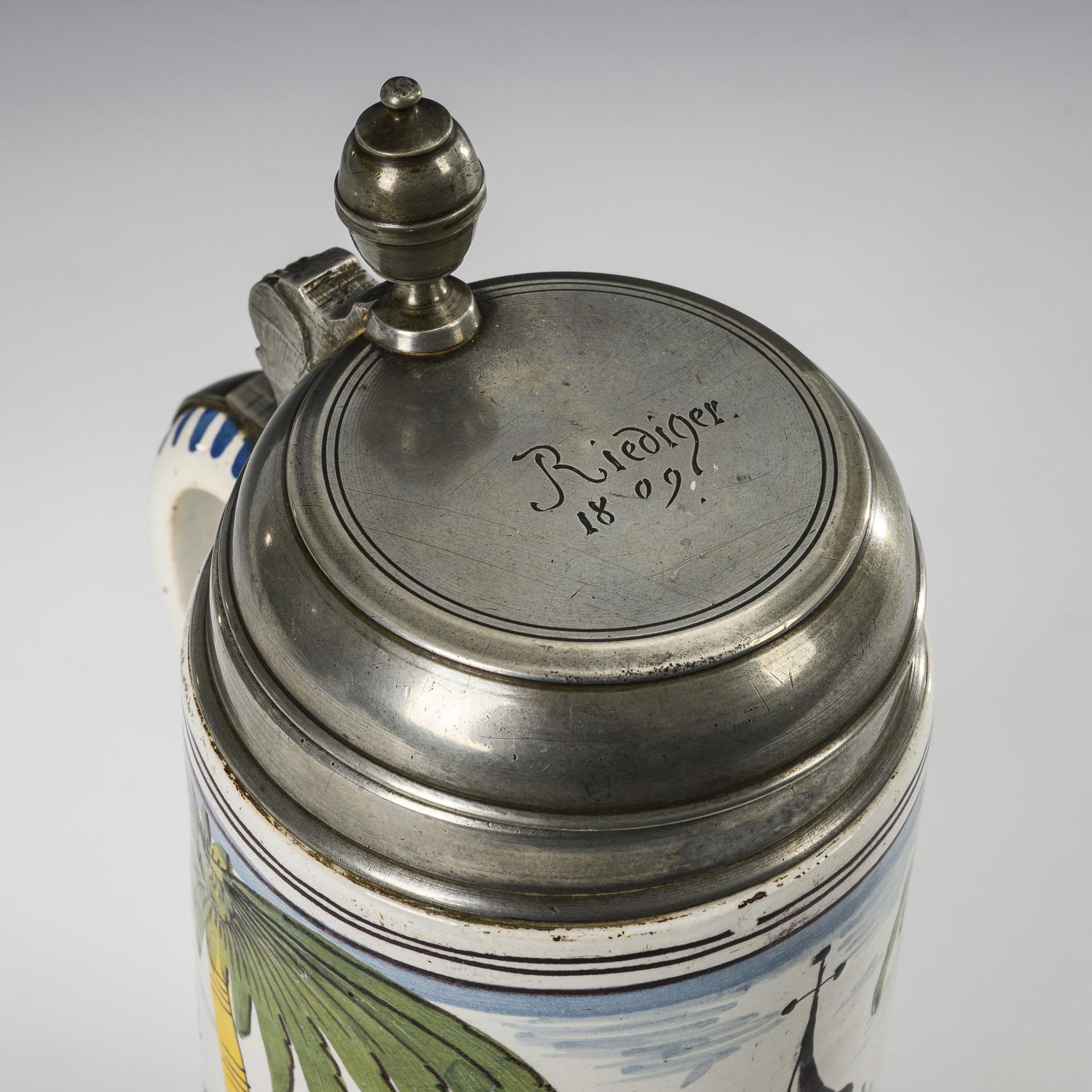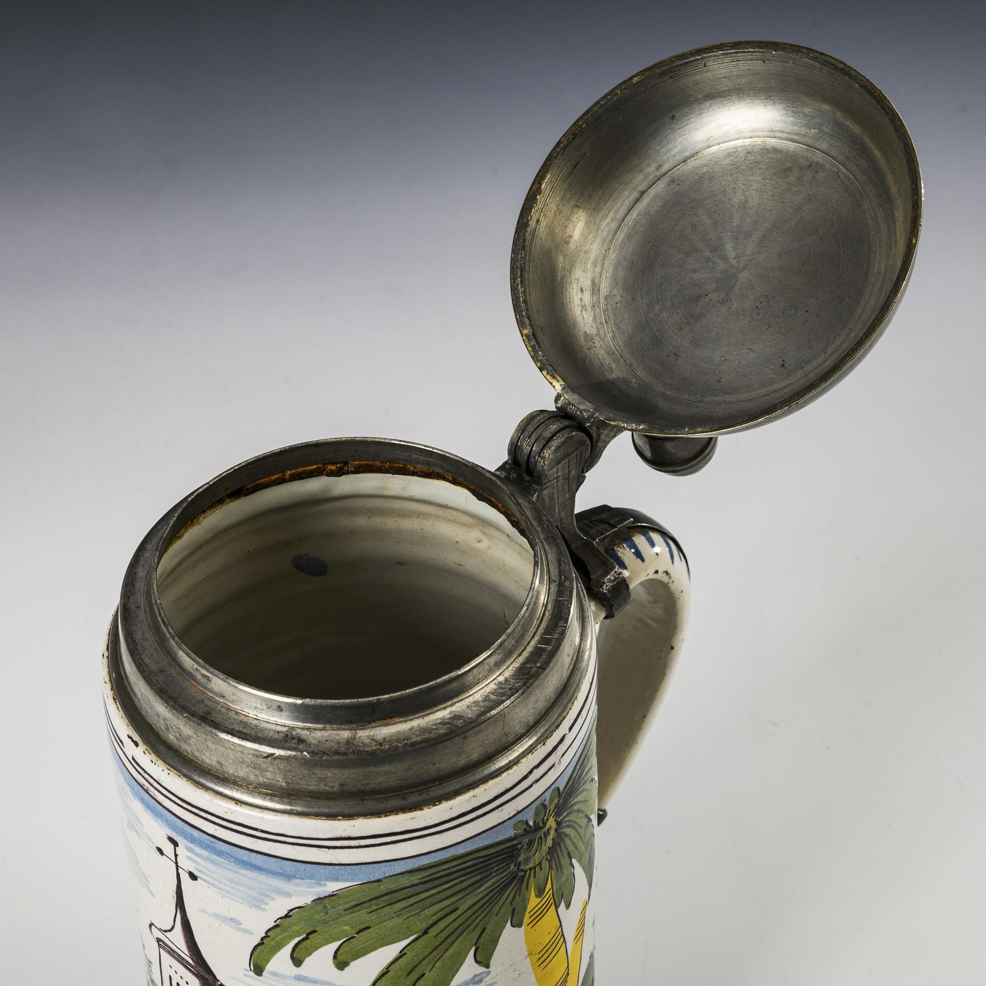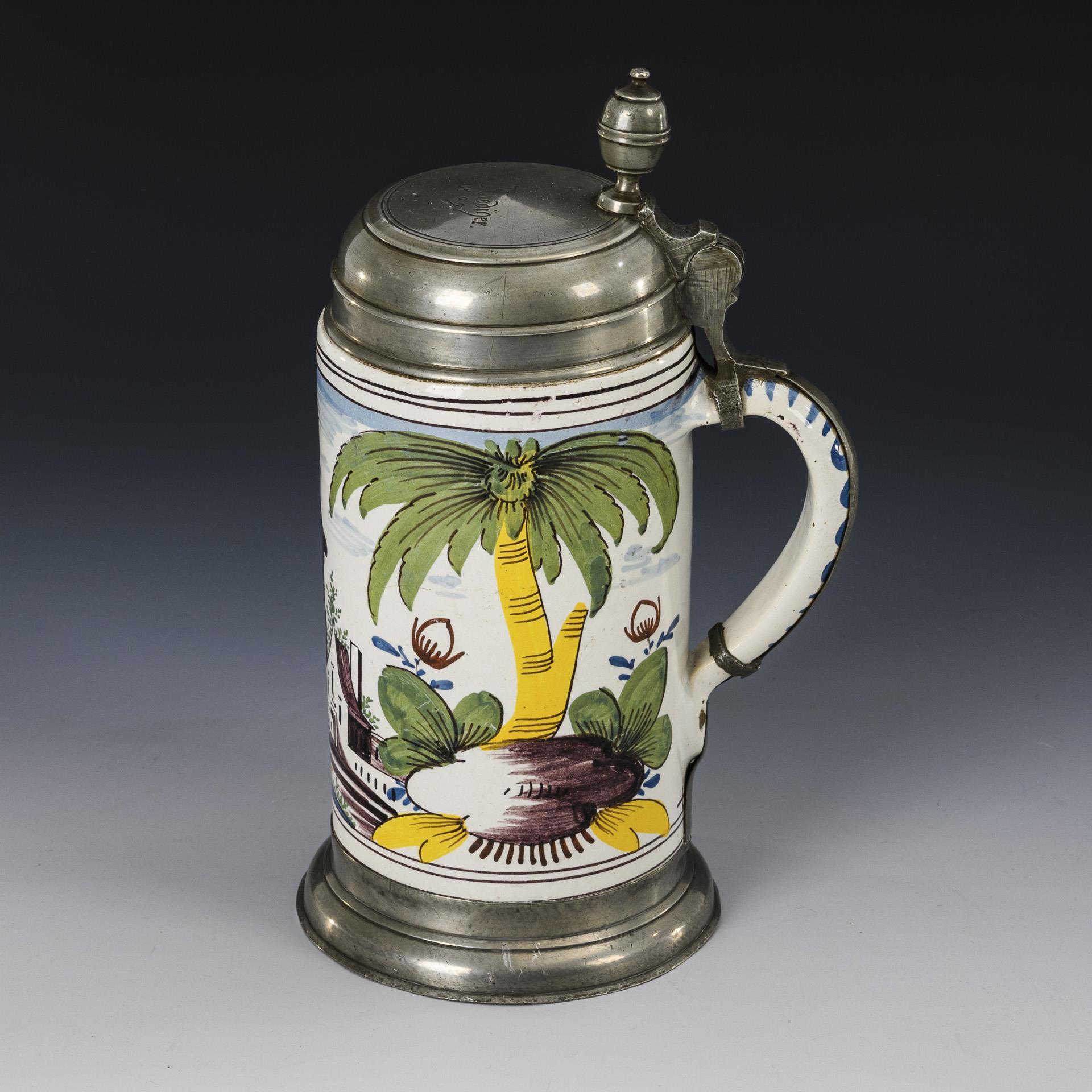 Cylindrical body with decorated ribbon handle, the front with city architecture flanked by palm trees. Pewter mount with "Riediger 1809" engraved lid, ball pusher, pewter band and pewter stand. Slightly chipped and rubbed in places to the glaze, pewter band defective at the lower base.