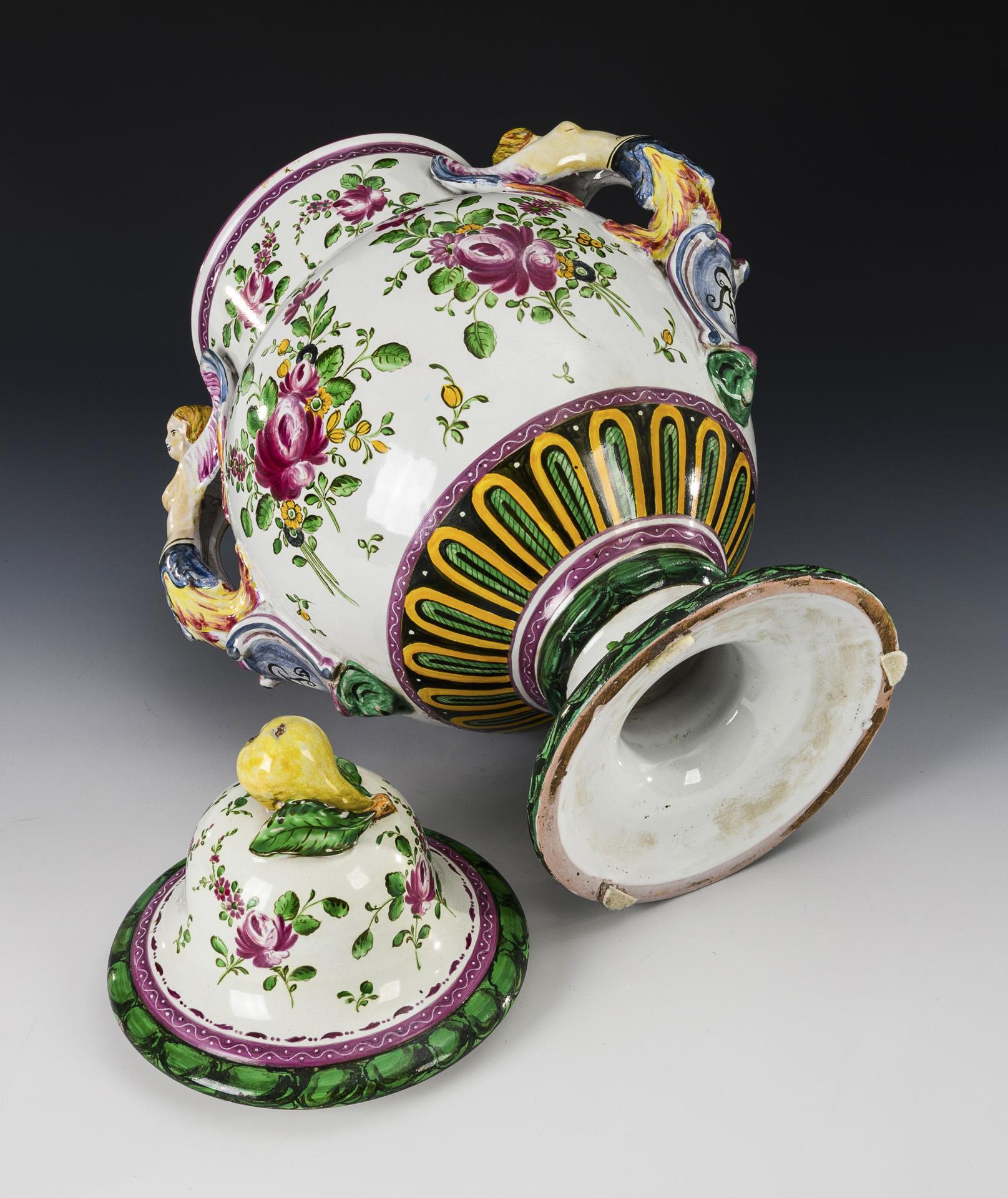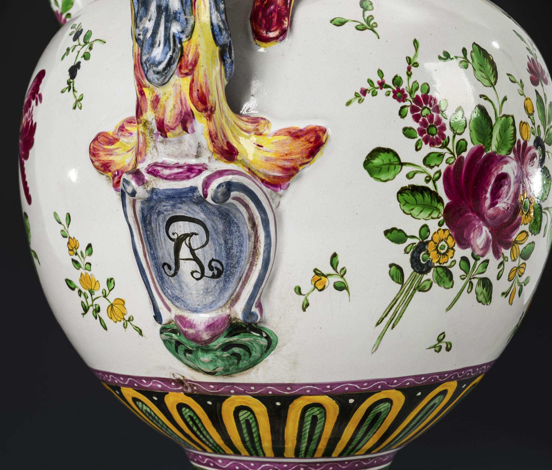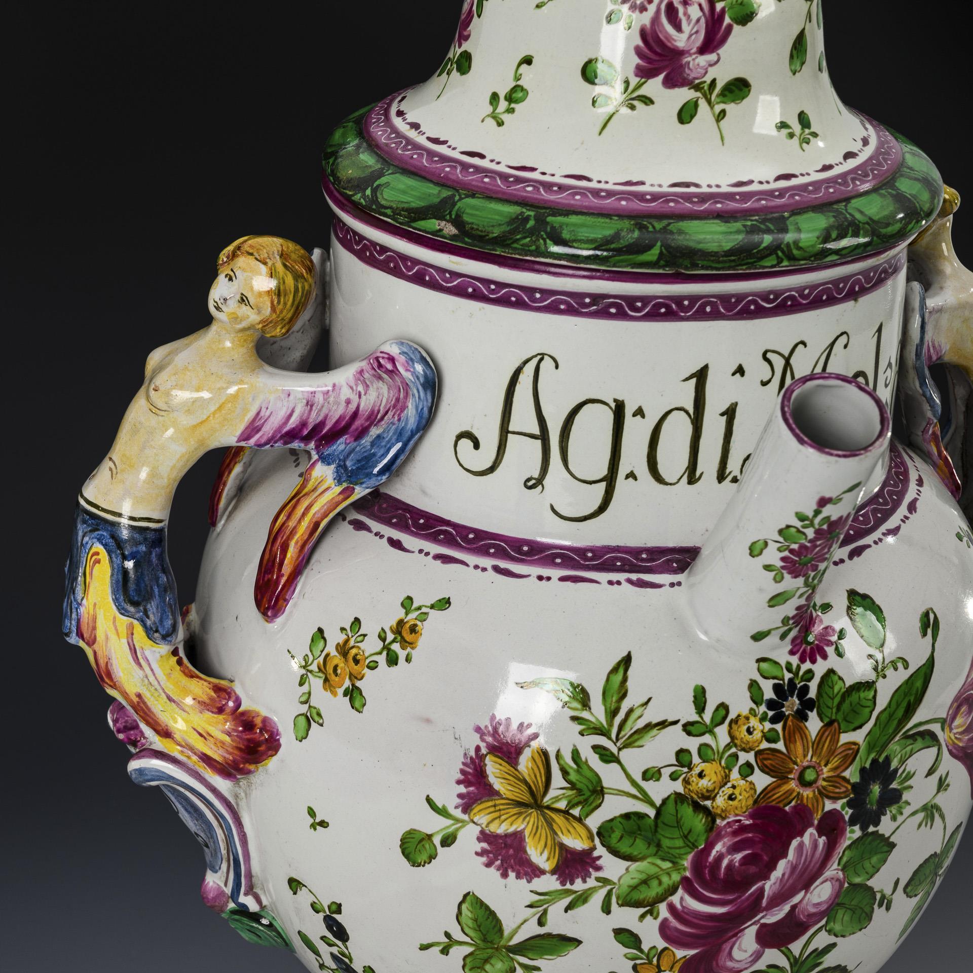 Globular jug with cylindrical neck and straight spout, 2 partly sculptural female herms as handles with baroque shield reserve and ligated monogram "AP", stepped round foot, bell-shaped lid with lemon finial. Fine floral painting all around, inscribed "Ag[ua] di Mel[i]ssa" (Melissa water). Partially chipped.