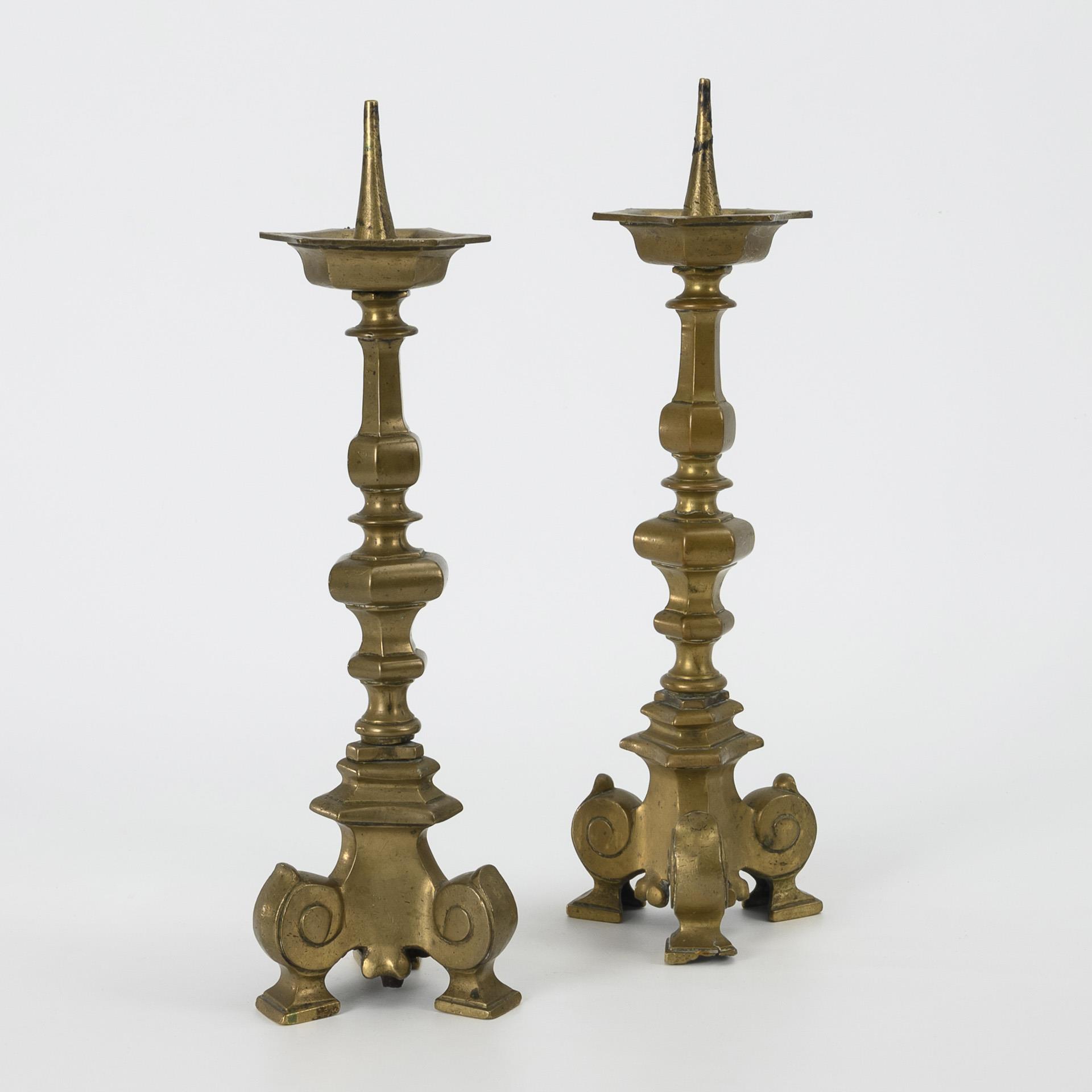 Massive bronze candlesticks in baroque forms with 3 volute legs and corresponding hexagonal baluster shaft and drip tray with bronze spike. 1 screw connection loose, 1 candlestick with 2 casting defects and 2 hairline cracks, each with signs of age/use.