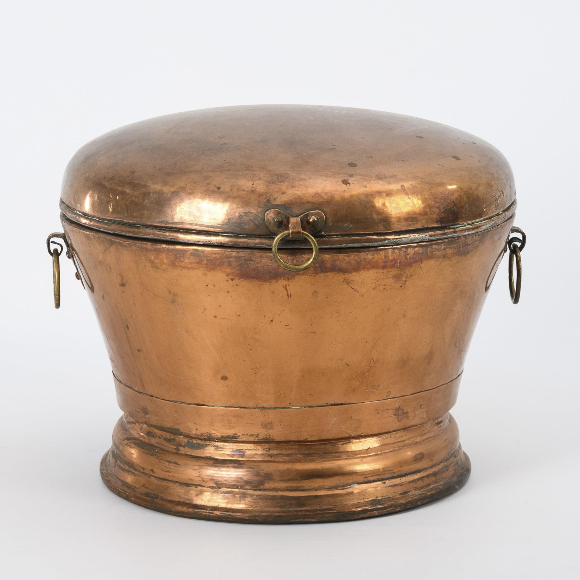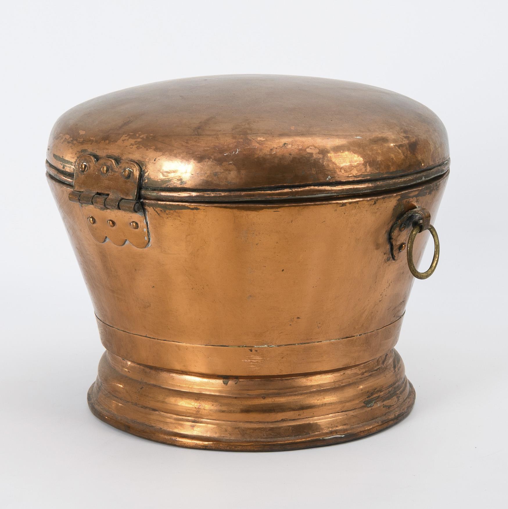Bread bin with profiled base, conical rising body and brass ring handles. Solder marks on the hinge and base, younger tin-plated, few signs of age/use.