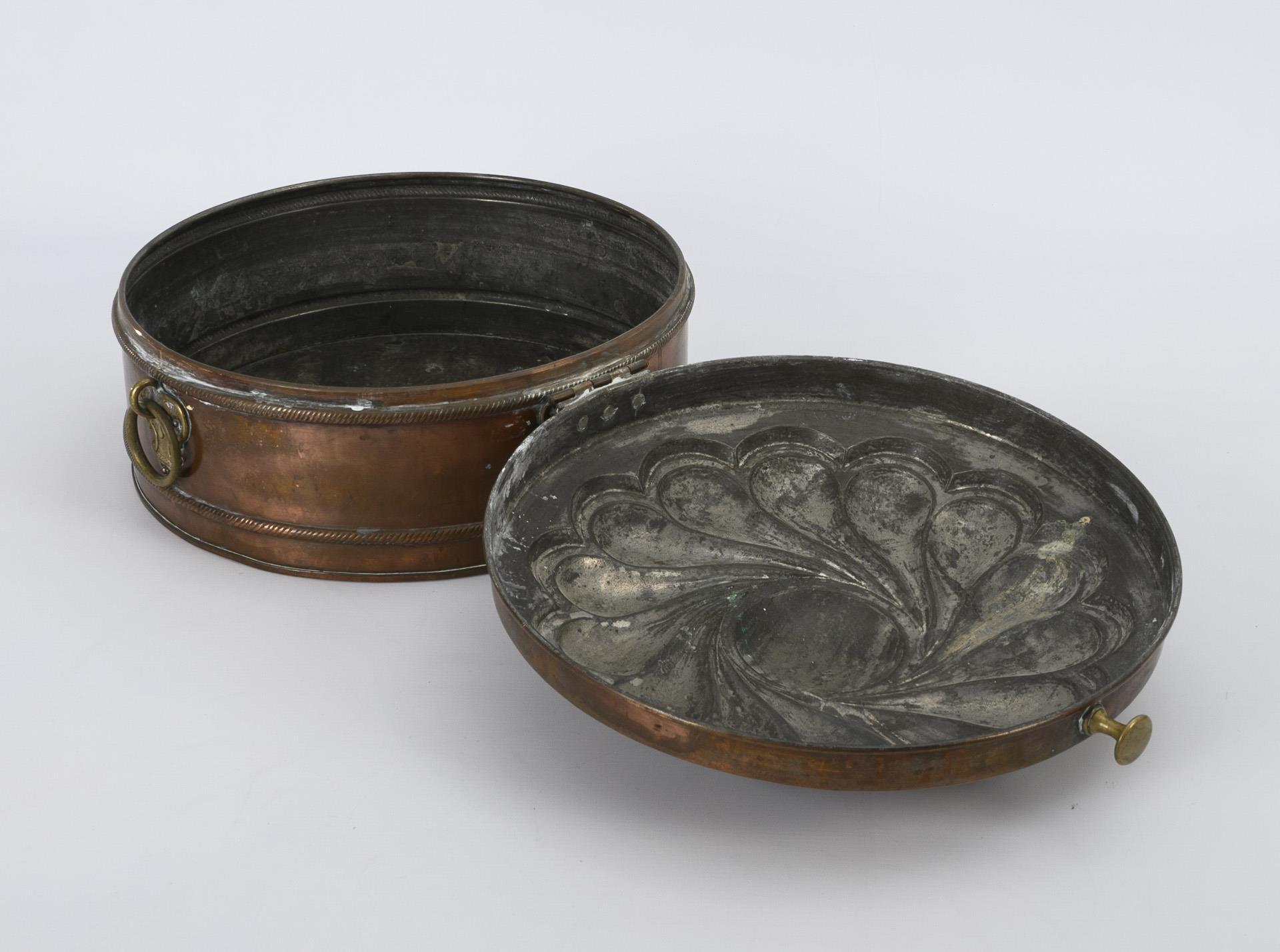 Copper partly embossed, tin-plated inside, brass. H 19 cm, Ø container 35.5 cm.