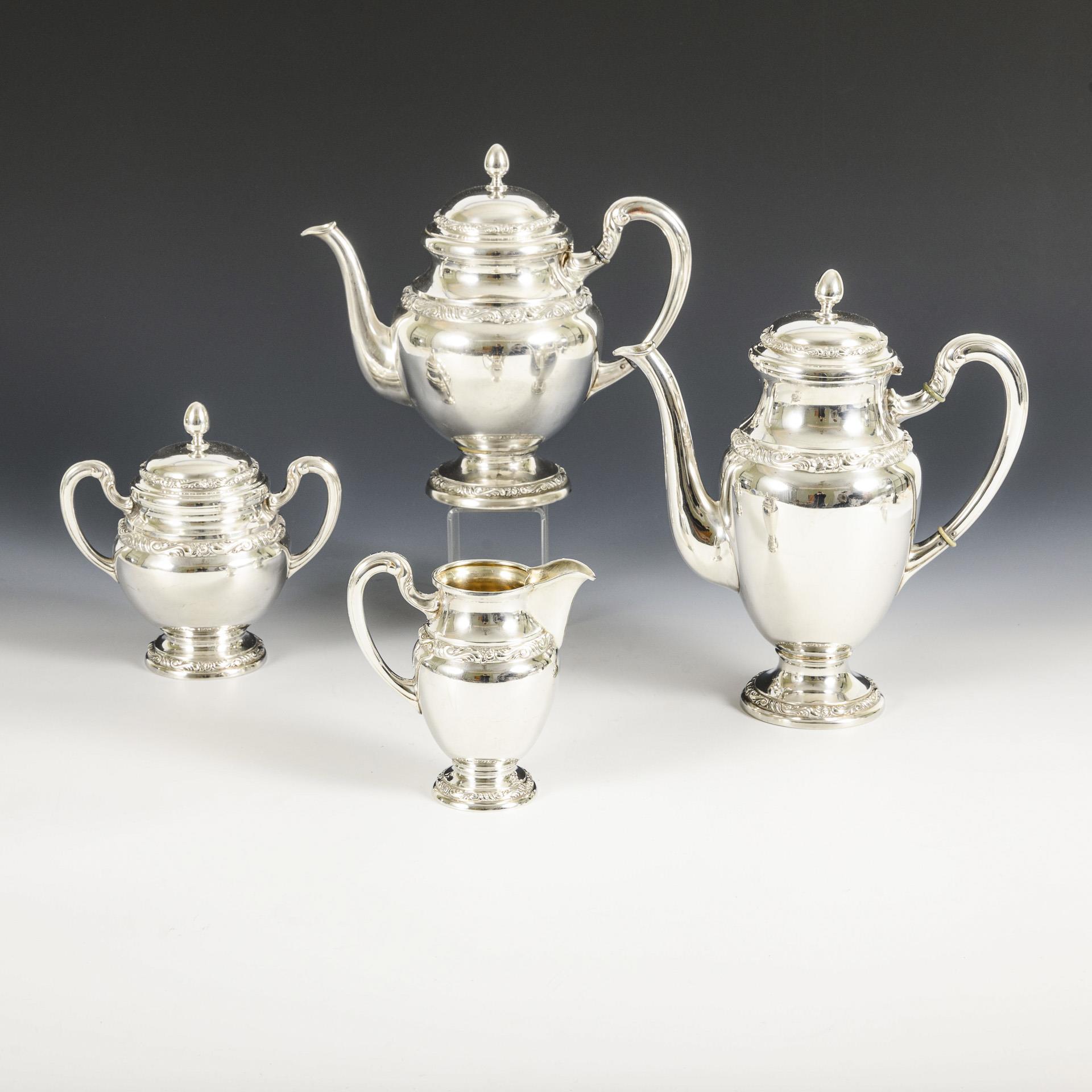 Bellied shape, decorated with relief friezes. Coffee pot (h 25.5 cm), teapot (h 22 cm), sugar bowl (h 16 cm) and milk jug (h 13.5 cm). Signs of use, knob of the coffee pot crushed.