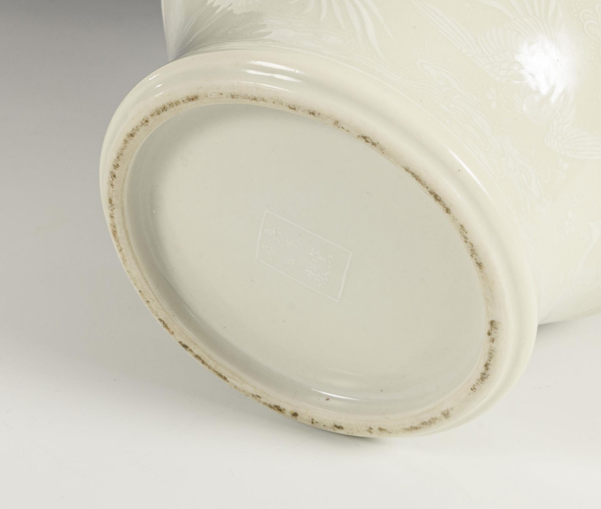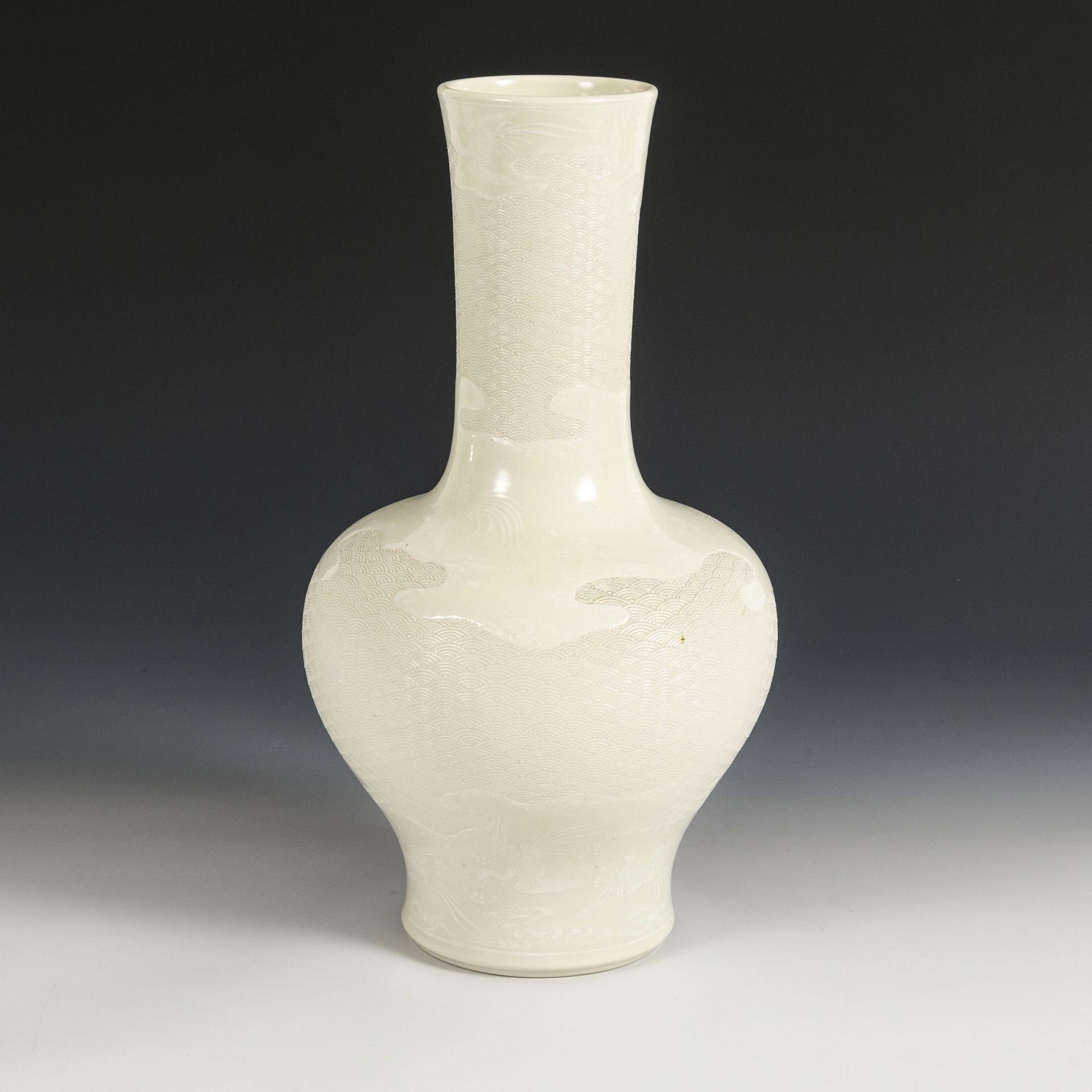 High-quality baluster vase with fine wave decoration in low relief and depictions of phoenixes in the glaze. Porcelain translucent despite strong body.
