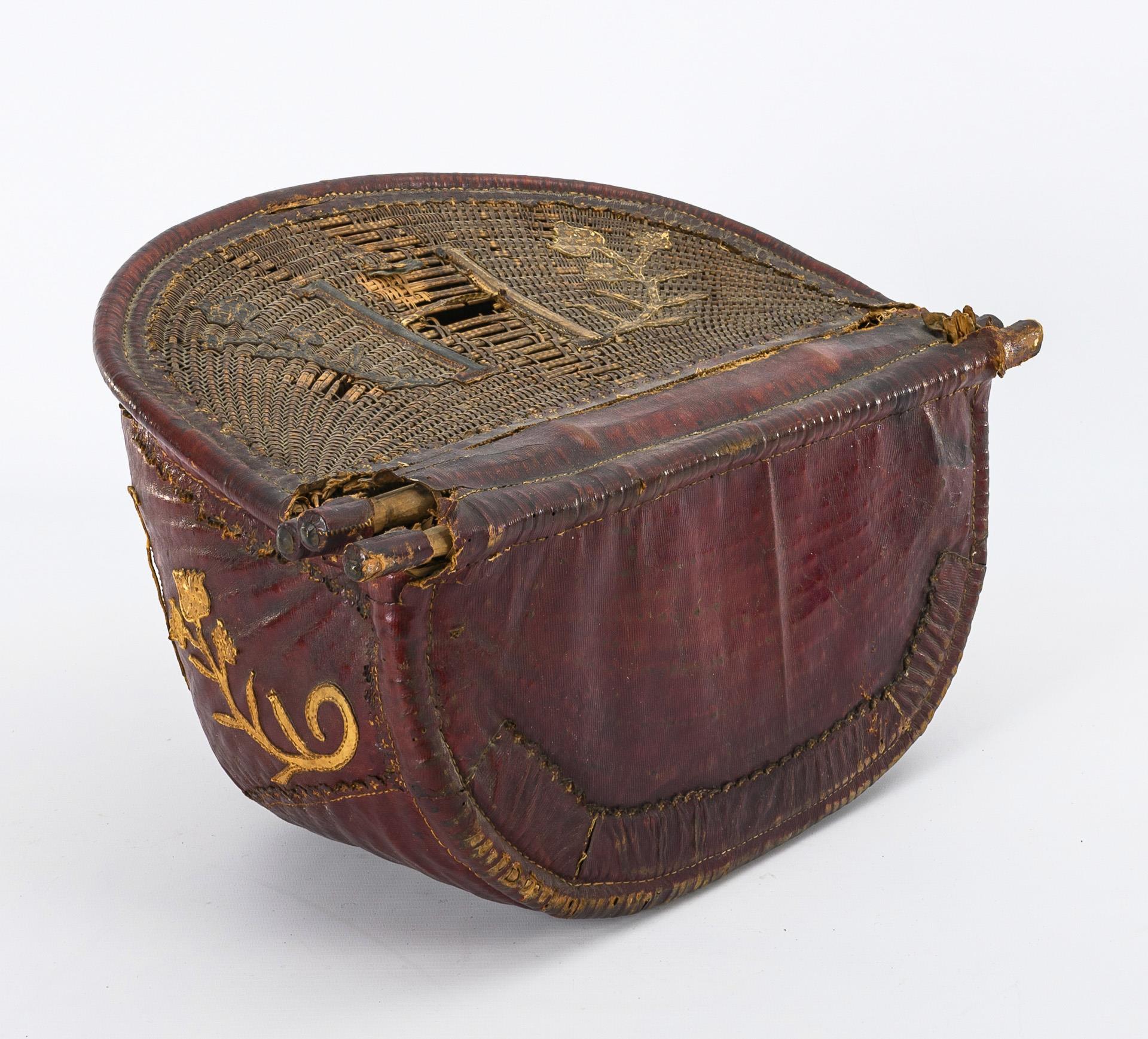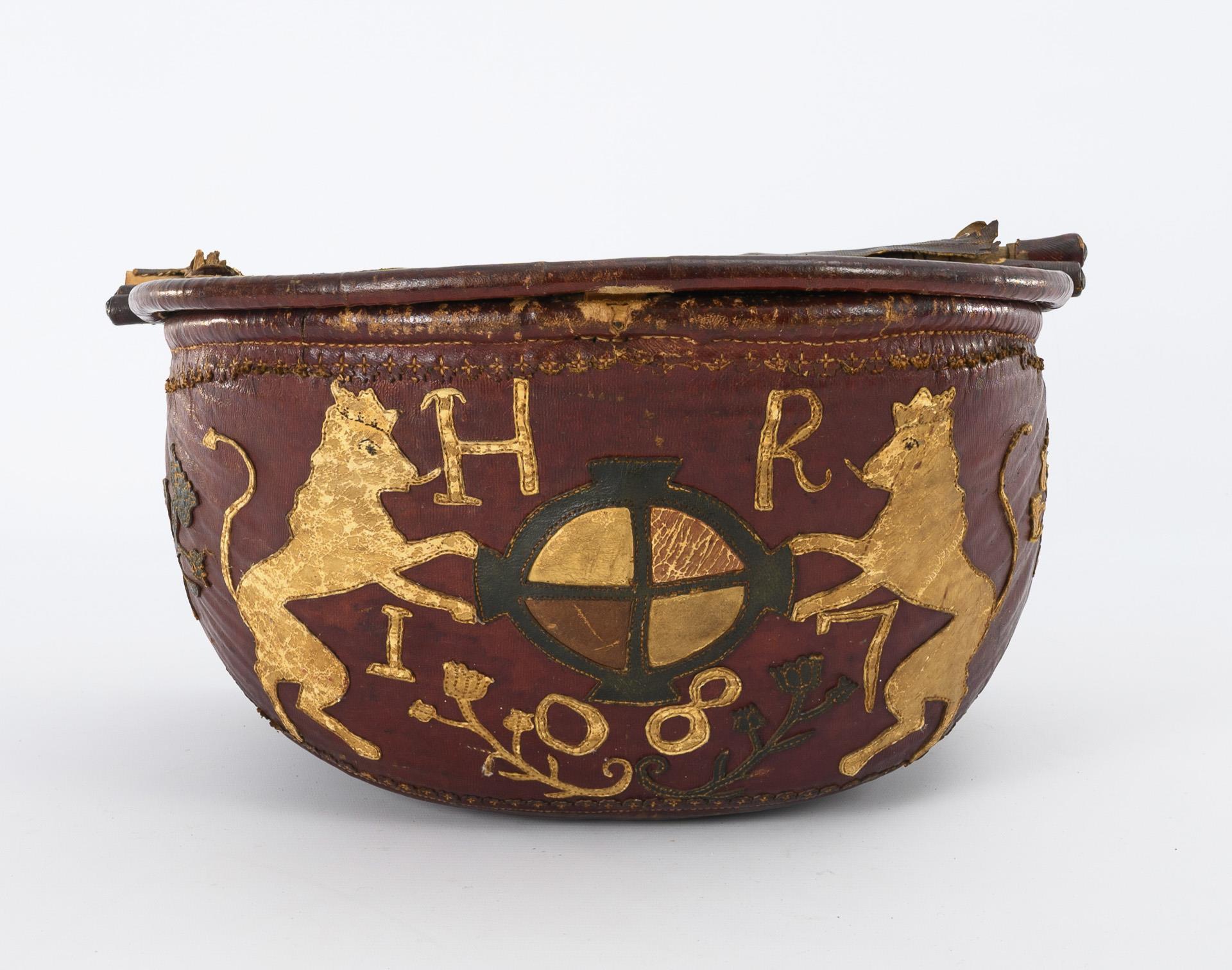Approximately quarter-spherical body covered with leather on all sides, but the lid only with the monogram "H" sewn on between flowers. In the front a cross shield held by lions similar to a coat of arms with monogram "HR" and date "1708" . In need of restoration, handle missing.
