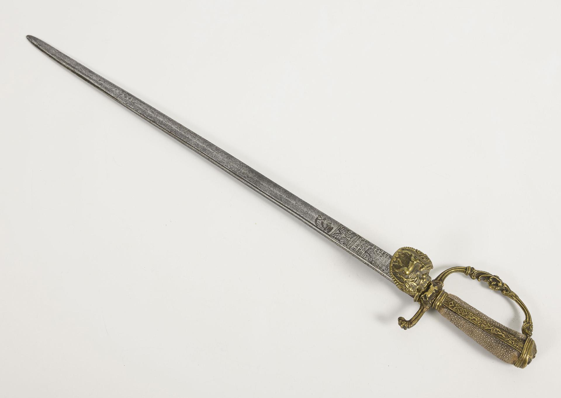 Straight, single-edged blade, tip somewhat rounded due to use. Engravings partly worn, but longer text: "ich bin ein hunter ich schiessen das wildt ich liebe ...". Brass grip with ray skin. Mounted old, but probably younger than the blade.