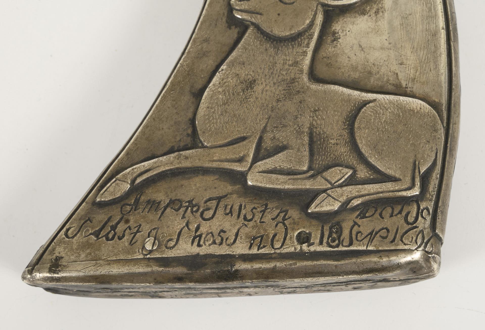 Powder flask with a stag in relief after Ridinger on both sides; the muzzle in the shape of a dog's head and metal knob on the wooden stopper. "Engraving" on both sides with the location Prussia and date "18. Sep. 1696". Some signs of age/use, small lead repair.