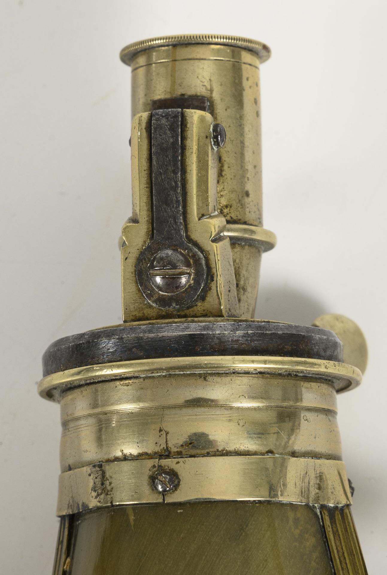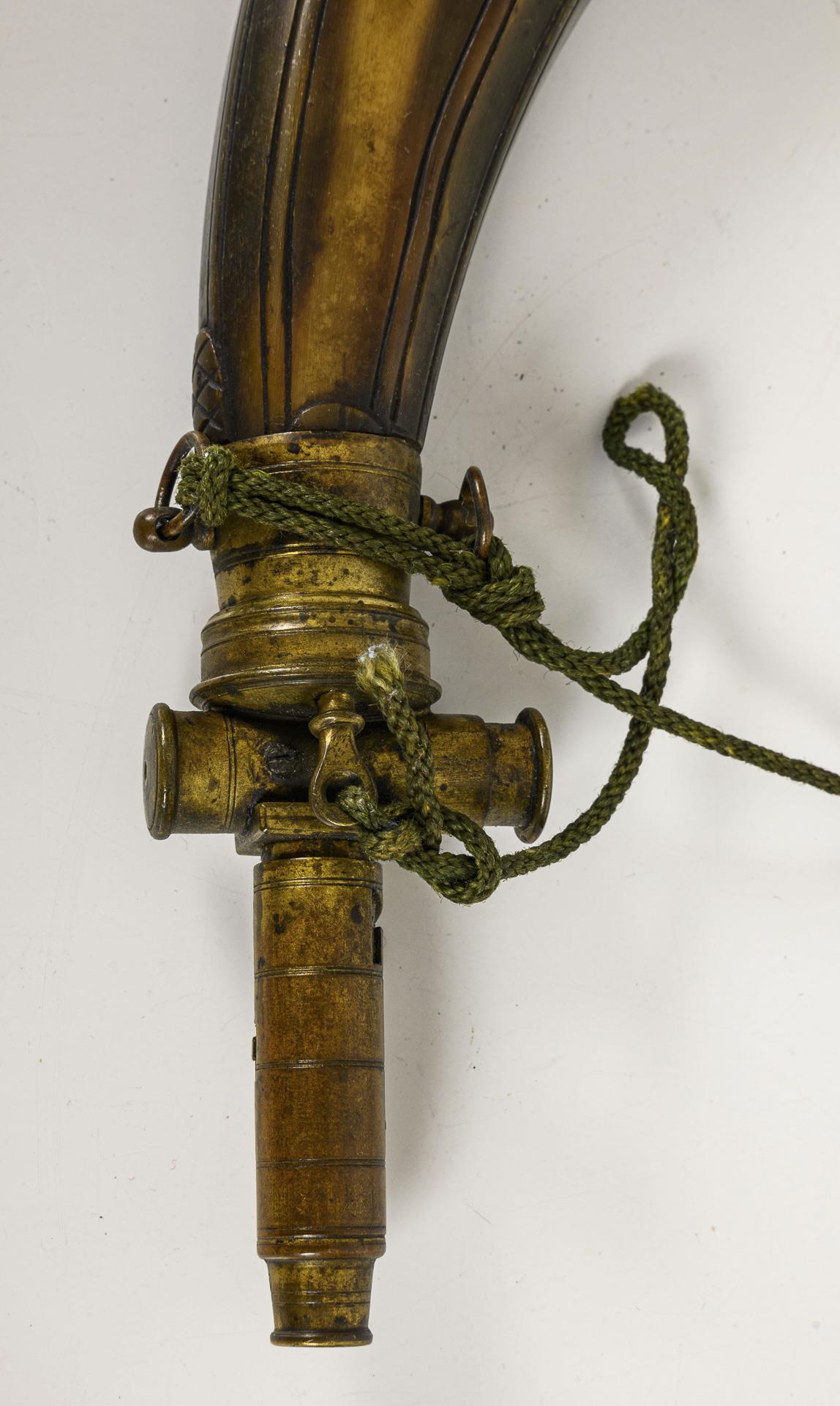 Large powder flask of pressed horn with brass mount and four-way adjustable brass dosing device / Small powder flask of transparent horn with brass mount and four-way adjustable nickel(?) dosing device. / Shot pouch of black leather with brass dosing device for 2 sizes. Dosing device of the large powder flask immovable. Small powder flask with hairline cracks. Leather shot pouch somewhat torn.