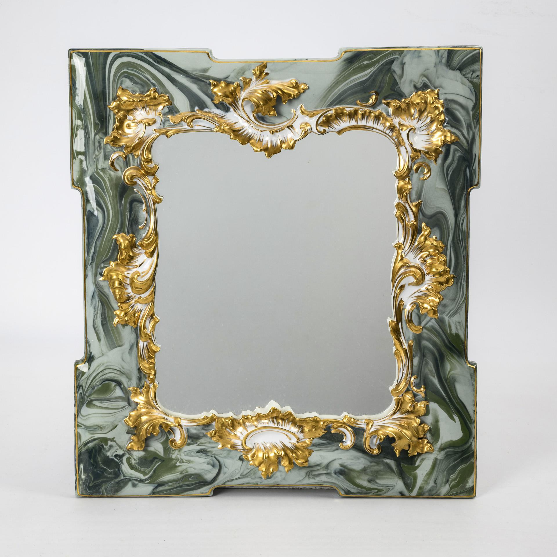 Rectangular frame painted in marble-effect green tones and rocaille relief in gold. 1 rocaille leaf stocked.