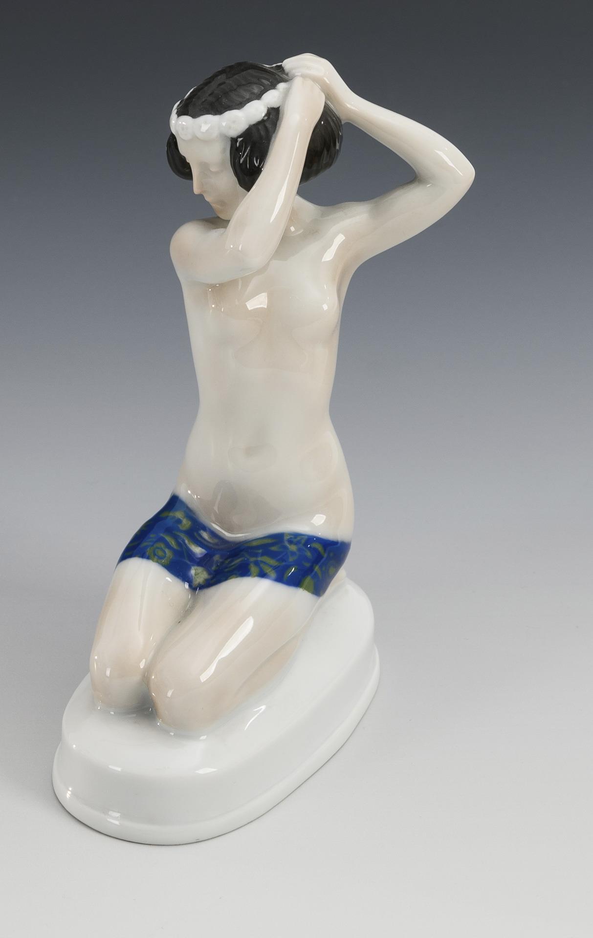 Kneeling nude of a young woman wearing a wreath of flowers in her hair .