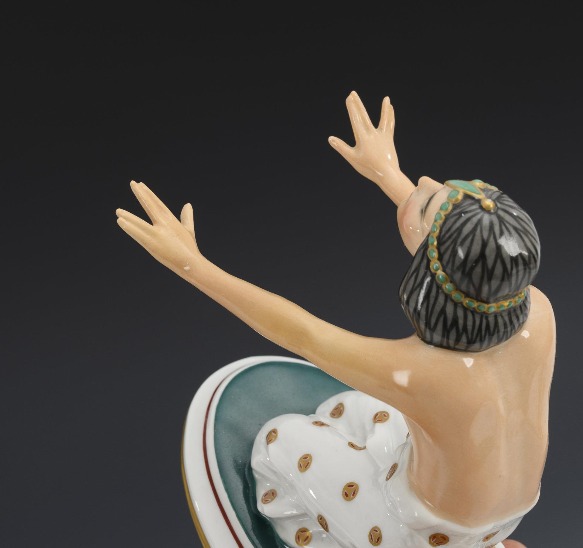 1x model no. K 442: A young woman playing the flute on a rectangular plinth in front of a "dancing" snake (h 19 cm). / 1x model no. K 437: A kneeling half nude of a young woman stretching out her arms on an oval plinth. With wooden base (h 14 cm, total h 18 cm). 3 fingers and shawm of the snake dancer restored, both arms and upper body of the Indian dancer restored.