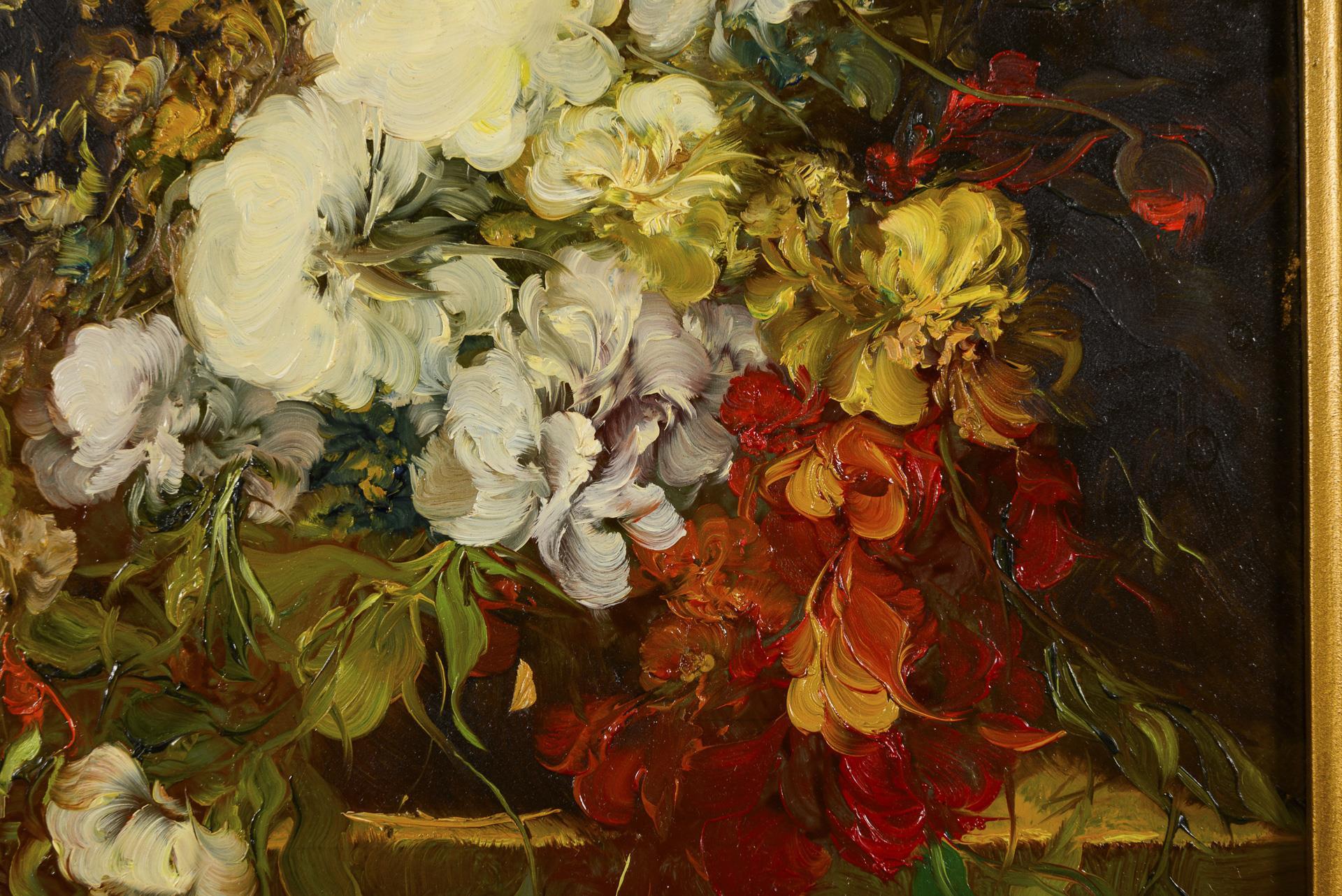 Expressively painted bouquet with white and red flowers on a ledge.