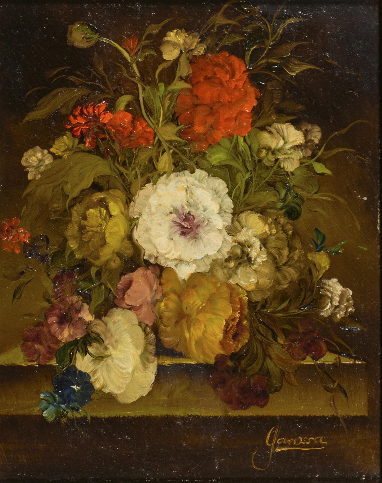 Small bouquet of flowers on a ledge in the style of the old masters.