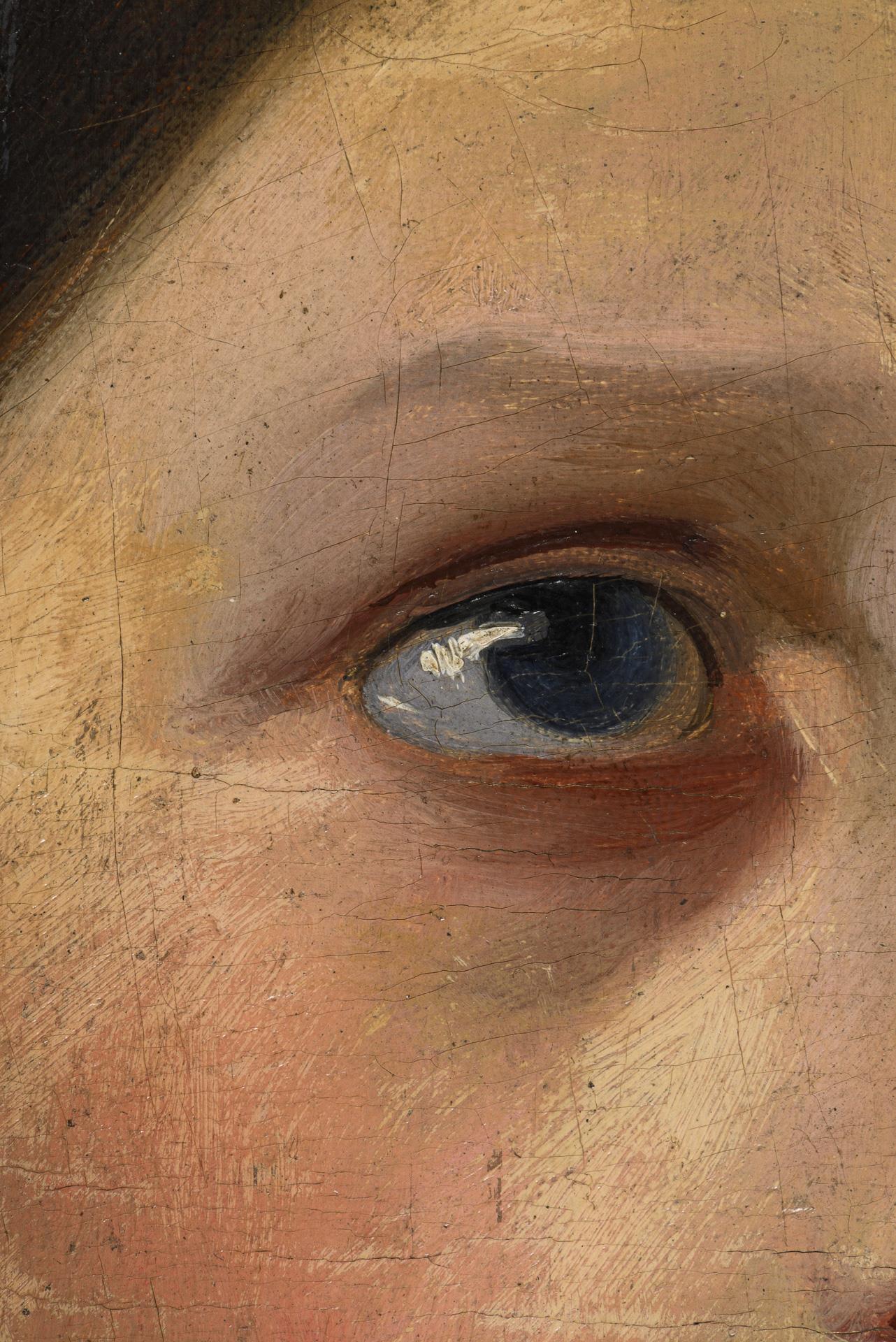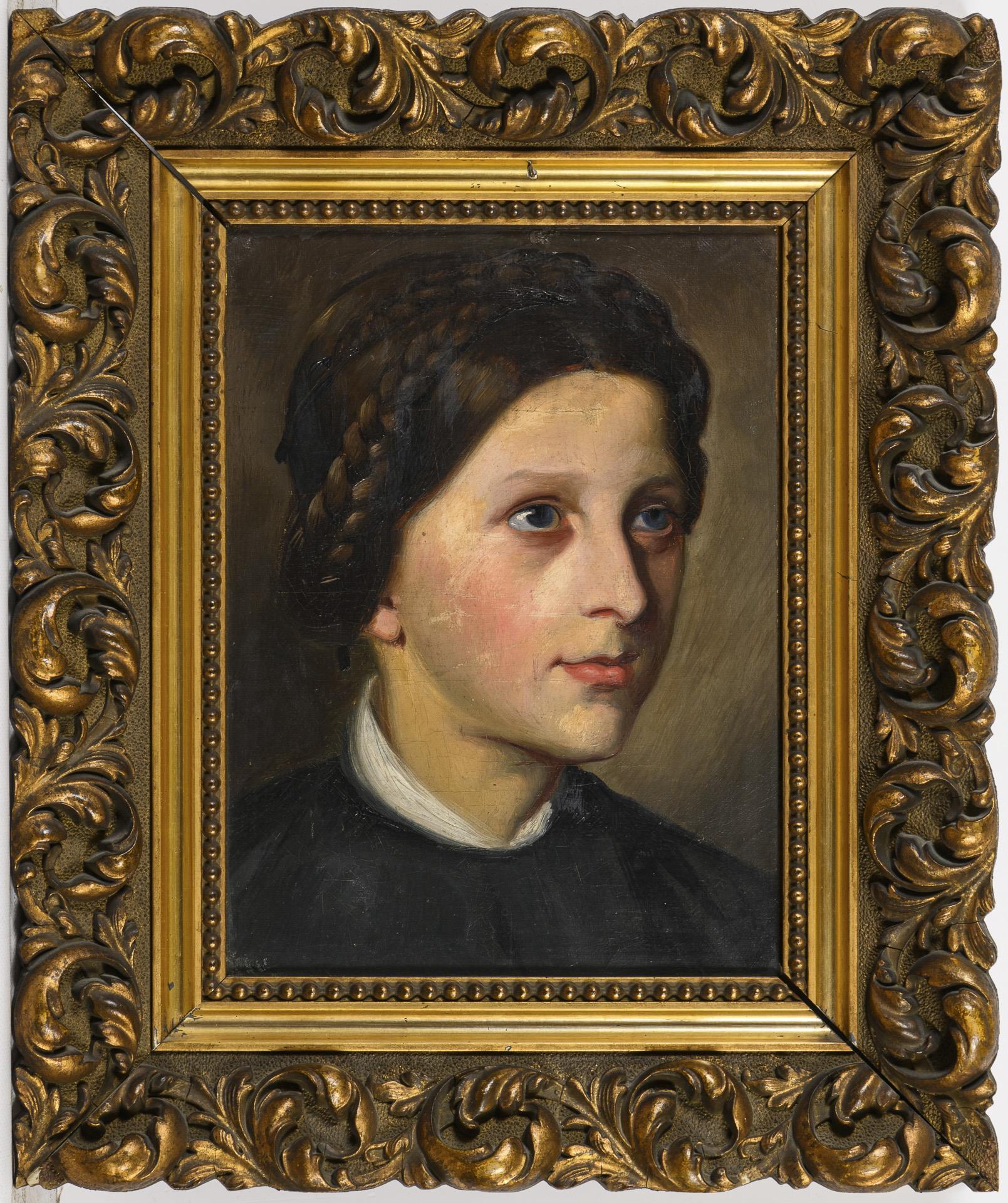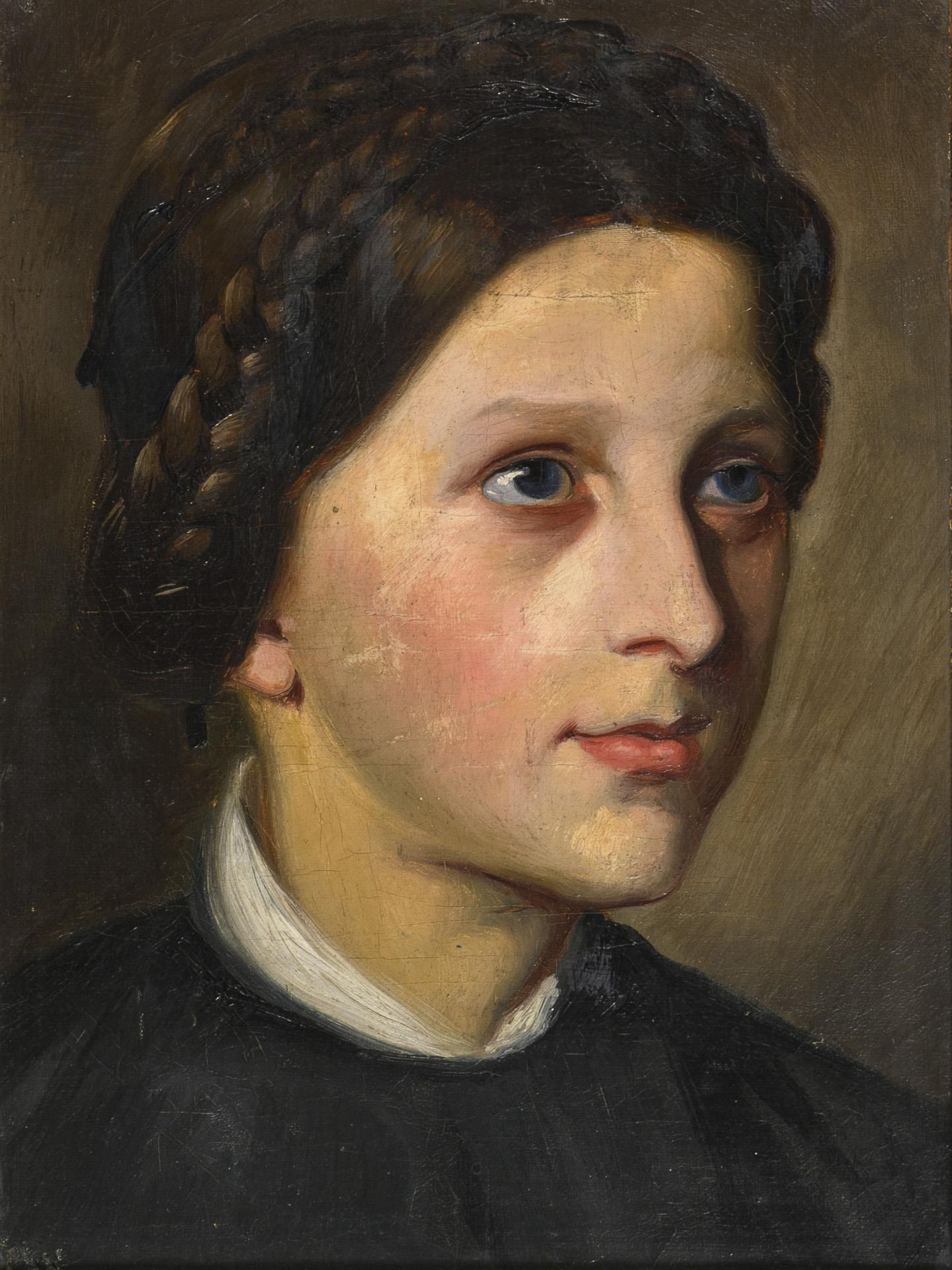 Portrait of a young woman with braided hair and in black clothing. Slight traces of age.