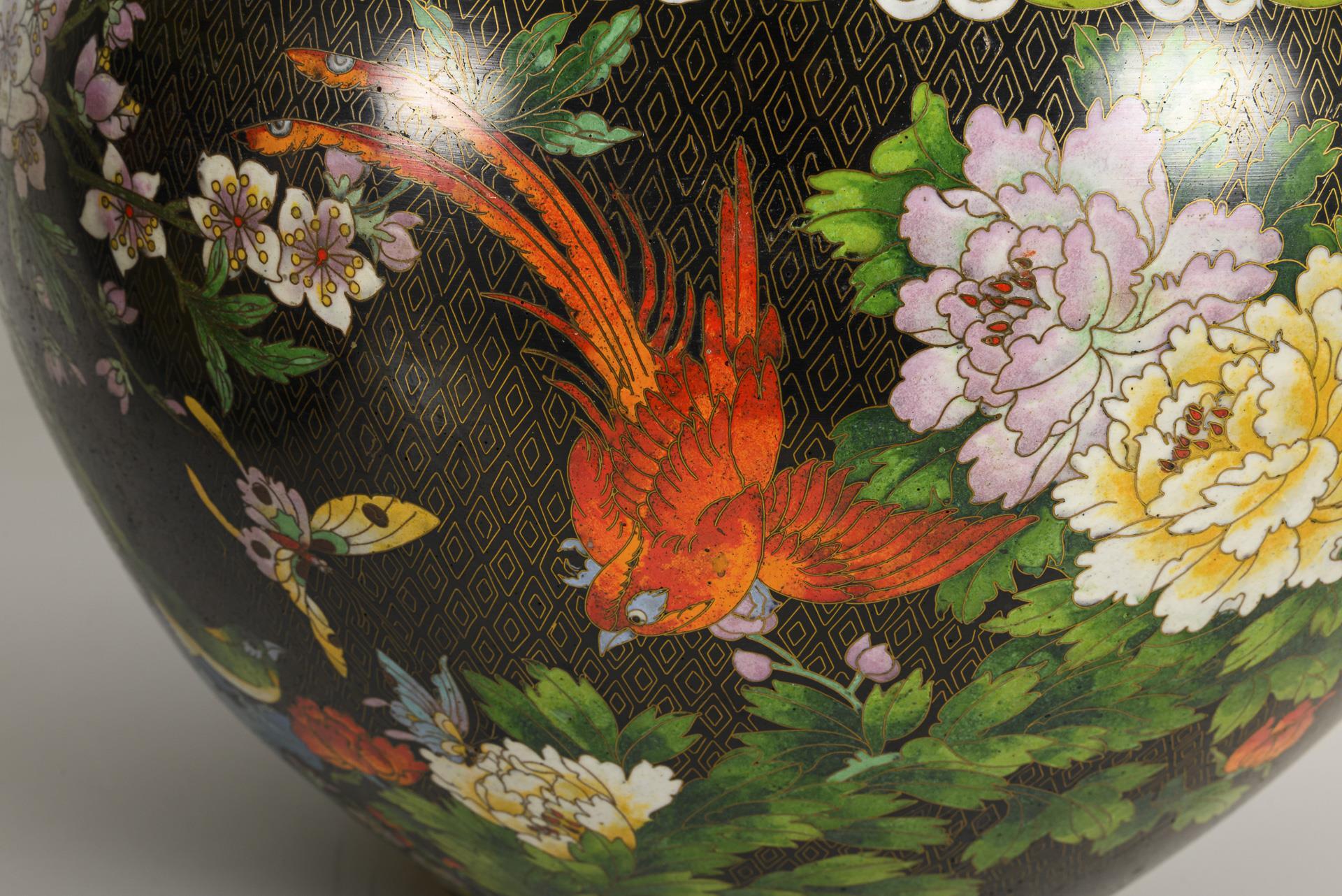 Black, diamond-shaped basic pattern with peonies and birds or chrysanthemums and birds in bold colors. Animal head handles on the sides. One edge somewhat stained.