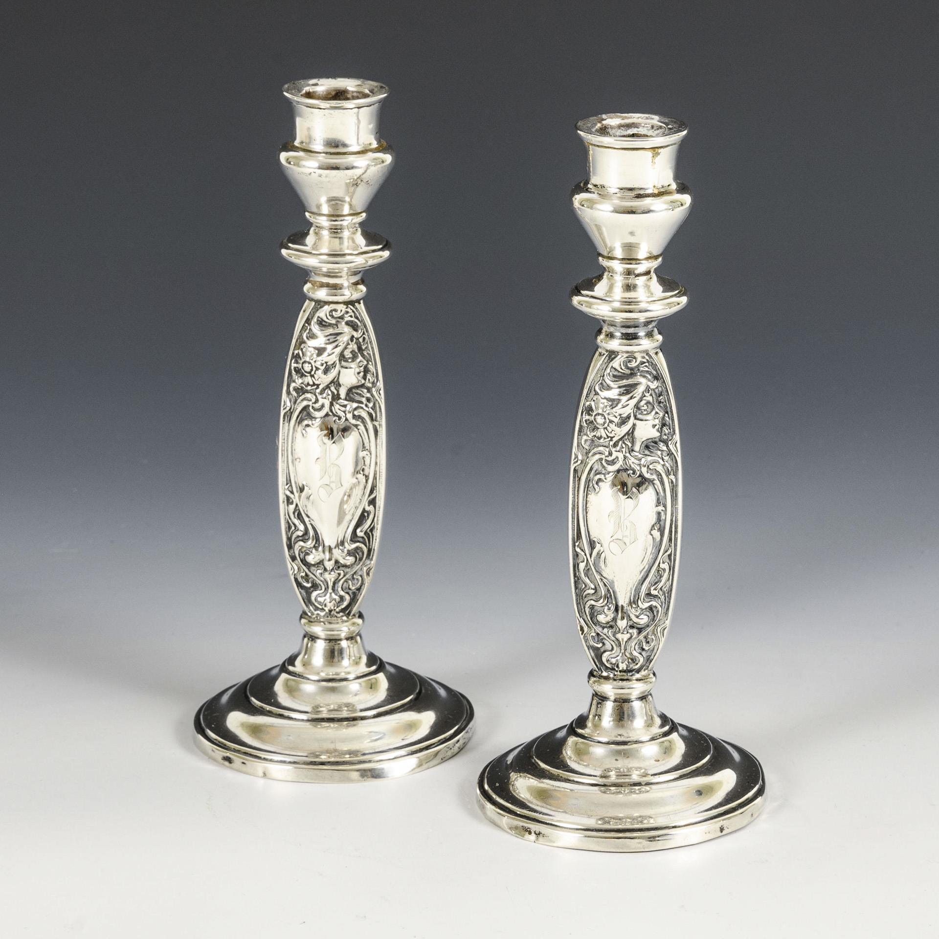 1-light candlestick with female head in relief and monogram engravings. Signs of age and wear, 1x with repaired break at the base of the shaft.