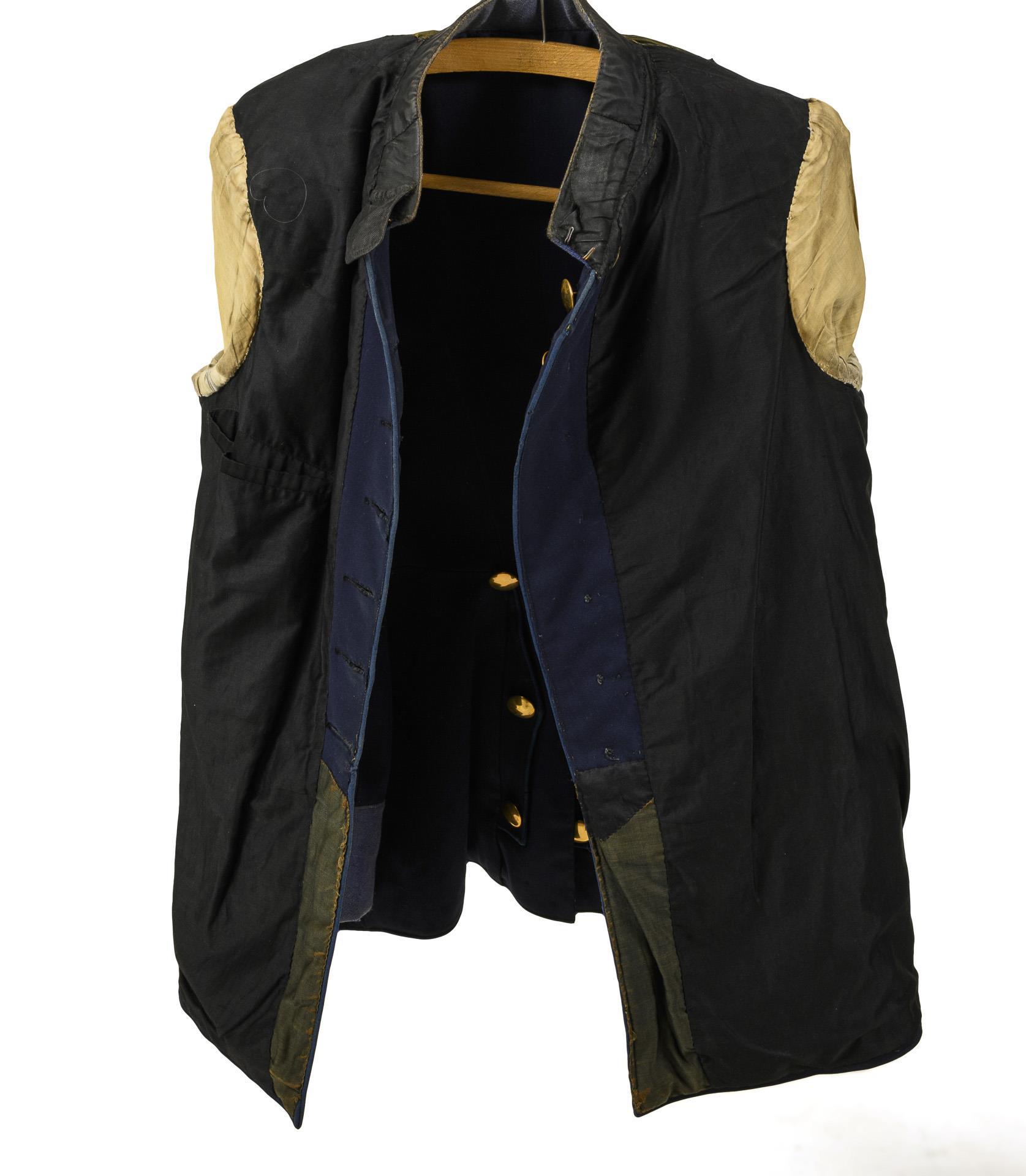 Dark blue wool fabric, white fabric band stripes on the shoulder, gold braid on the collar, brass buttons, viscose lining, white lacquered leather, brass belt buckle. Size 46, L belt 104 - 109 possible.